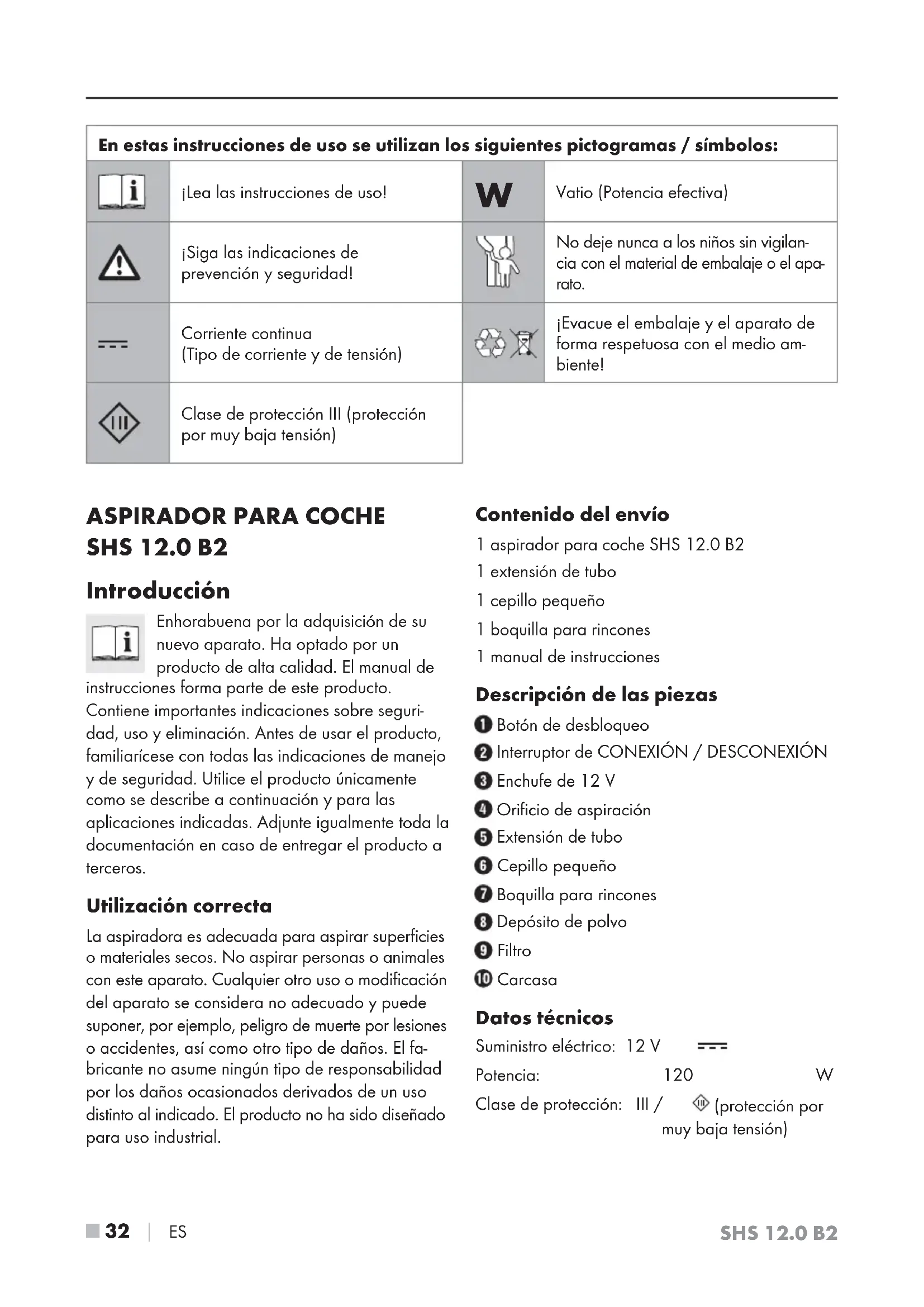 Vatio (Potencia efectiva) ¡Siga las indicaciones de prevención y seguridad! No deje nunca a los niños sin vigilan- cia con el material de embalaje o el apa- rato. Corriente continua (Tipo de corriente y de tensión) ¡Evacue el embalaje y el aparato de forma respetuosa con el medio am- biente! Clase de protección III (protección por muy baja tensión)SHS 12.0 B2 ES