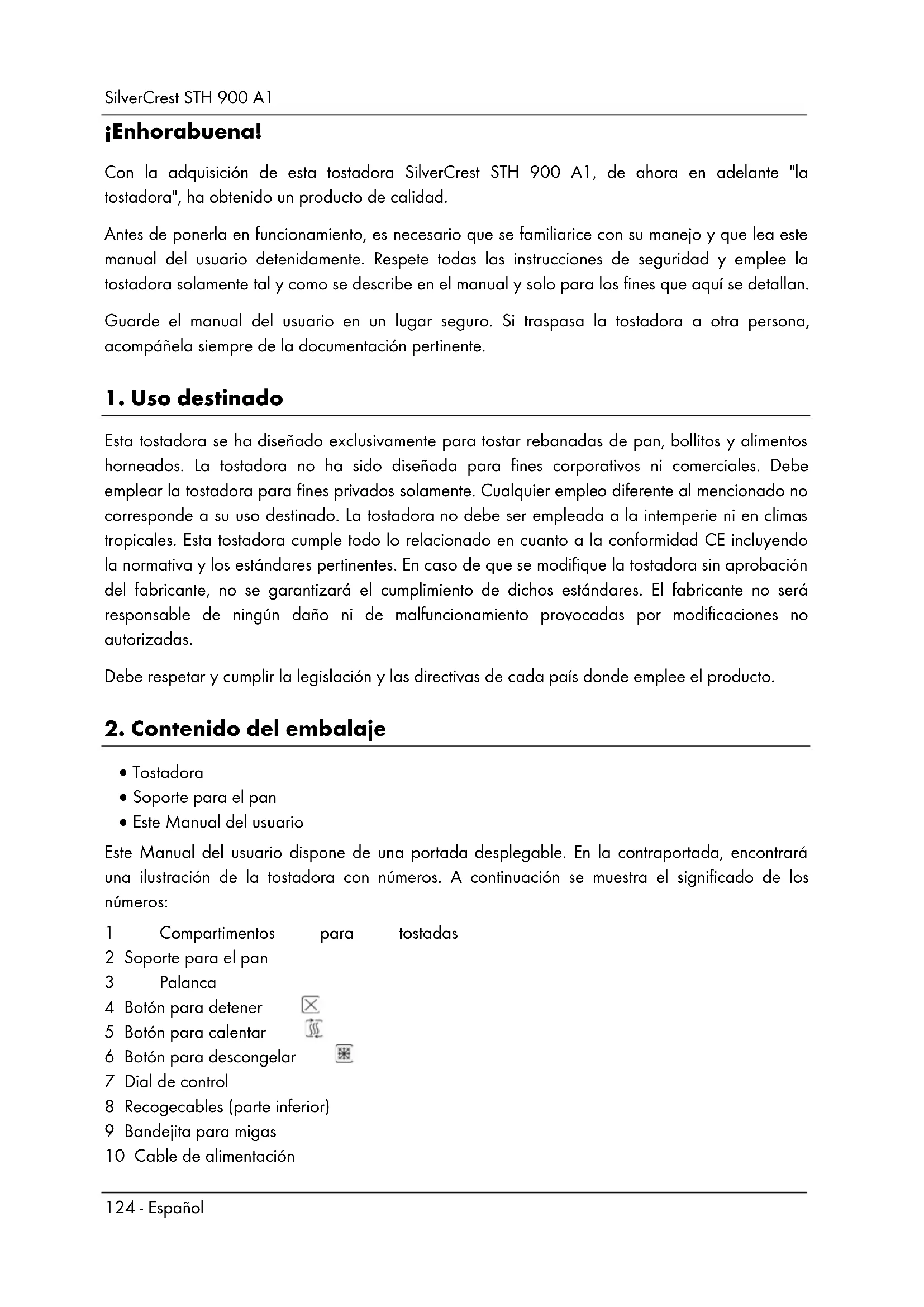 ¡Enhorabuena! Con la adquisición de esta tostadora SilverCrest STH 900 A1, de ahora en adelante "la tostadora", ha obtenido un producto de calidad. Antes de ponerla en funcionamiento, es necesario que se familiarice con su manejo y que lea este manual del usuario detenidamente. Respete todas las instrucciones de seguridad y emplee la tostadora solamente tal y como se describe en el manual y solo para los fines que aquí se detallan. Guarde el manual del usuario en un lugar seguro. Si traspasa la tostadora a otra persona, acompáñela siempre de la documentación pertinente.