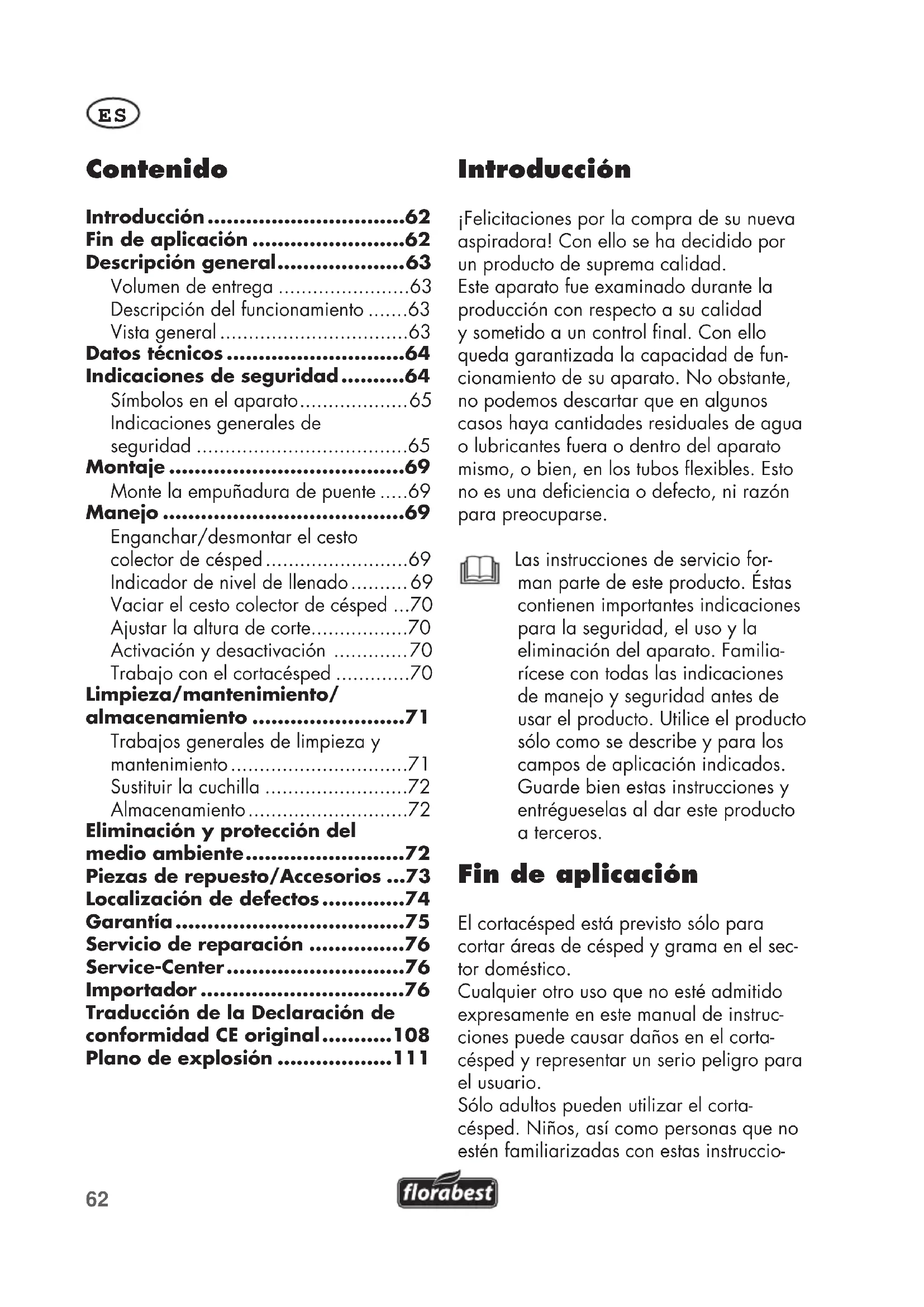 - Plano de explosión Introducción ¡Felicitaciones por la compra de su nueva aspiradora! Con ello se ha decidido por un producto de suprema calidad. Este aparato fue examinado durante la producción con respecto a su calidad y sometido a un control nal. Con ello queda garantizada la capacidad de fun- cionamiento de su aparato. No obstante, no podemos descartar que en algunos casos haya cantidades residuales de agua o lubricantes fuera o dentro del aparato mismo, o bien, en los tubos exibles. Esto no es una deciencia o defecto, ni razón para preocuparse. Las instrucciones de servicio for- man parte de este producto. Éstas contienen importantes indicaciones para la seguridad, el uso y la eliminación del aparato. Familia- rícese con todas las indicaciones de manejo y seguridad antes de usar el producto. Utilice el producto sólo como se describe y para los campos de aplicación indicados. Guarde bien estas instrucciones y entrégueselas al dar este producto a terceros. Fin de aplicación El cortacésped está previsto sólo para cortar áreas de césped y grama en el sec- tor doméstico. Cualquier otro uso que no esté admitido expresamente en este manual de instruc- ciones puede causar daños en el corta- césped y representar un serio peligro para el usuario. Sólo adultos pueden utilizar el corta- césped. Niños, así como personas que no estén familiarizadas con estas instruccio-63 p. 111