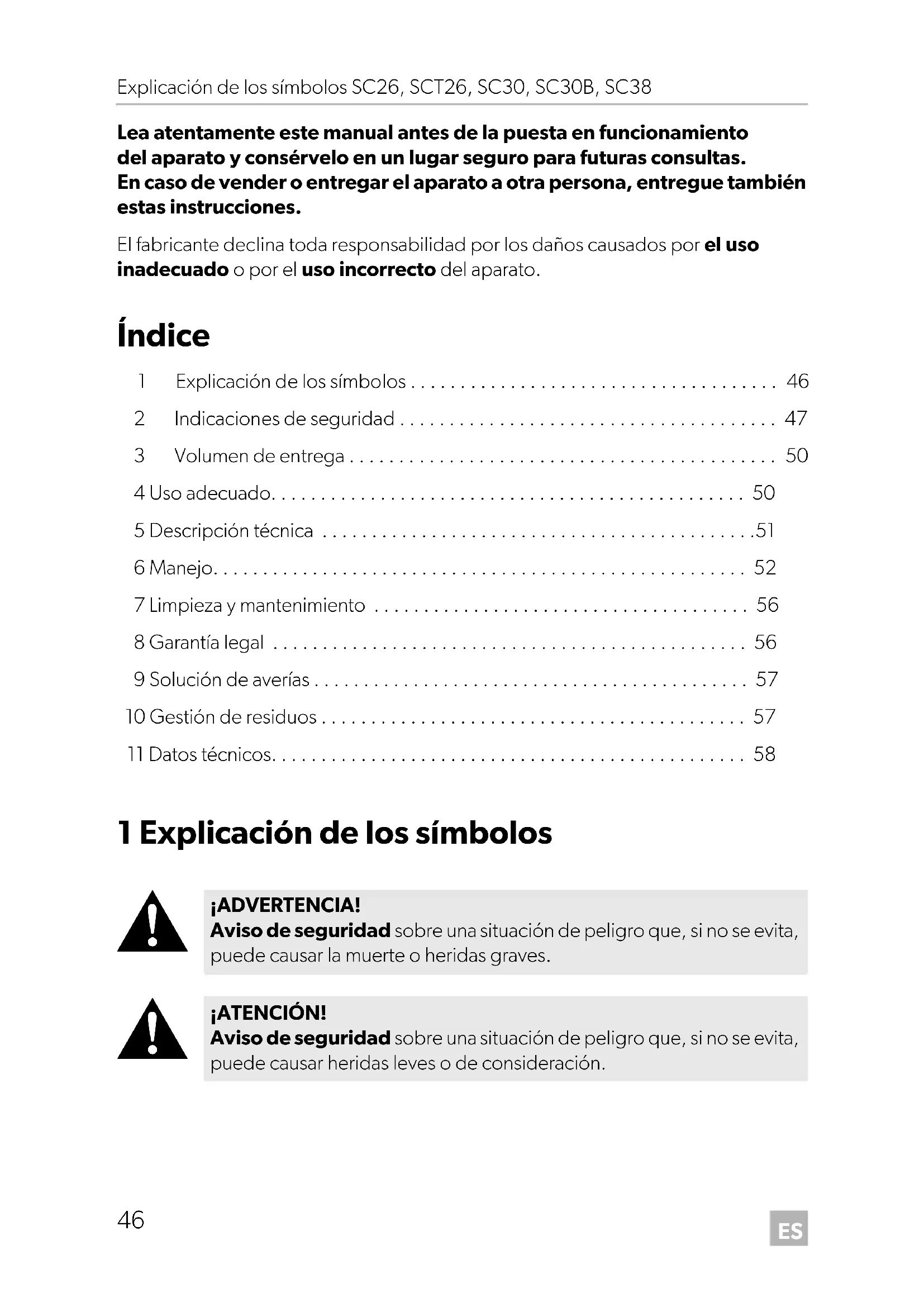 - Lea atentamente este manual antes de la puesta en funcionamiento del aparato y consérvelo en un lugar seguro para futuras consultas. En caso de vender o entregar el aparato a otra persona, entregue también estas instrucciones. El fabricante declina toda responsabilidad por los daños causados por el uso inadecuado o por el uso incorrecto del aparato. Índice 1 Explicación de los símbolos p. 46