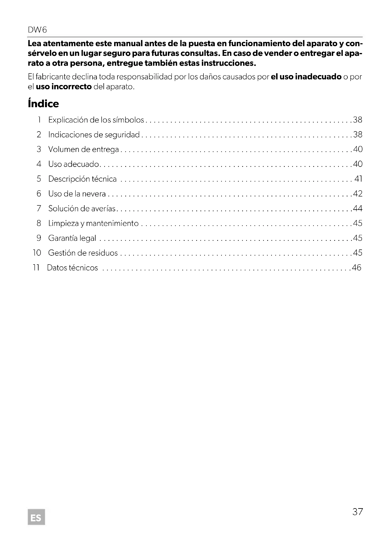 - Lea atentamente este manual antes de la puesta en funcionamiento del aparato y con- sérvelo en un lugar seguro para futuras consultas. En caso de vender o entregar el apa- rato a otra persona, entregue también estas instrucciones. El fabricante declina toda responsabilidad por los daños causados por el uso inadecuado o por el uso incorrecto del aparato. Índice 1 Explicación de los símbolos p. 38