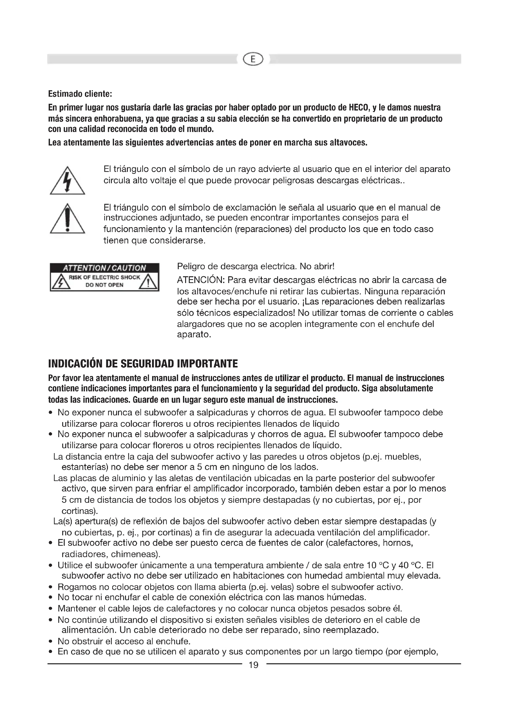 Estimado cliente: En primer lugar nos gustaría darle las gracias por haber optado por un producto de HECO, y le damos nuestra más sincera enhorabuena, ya que gracias a su sabia elección se ha convertido en proprietario de un producto con una calidad reconocida en todo el mundo. Lea atentamente las siguientes advertencias antes de poner en marcha sus altavoces. El triángulo con el símbolo de un rayo advierte al usuario que en el interior del aparato circula alto voltaje el que puede provocar peligrosas descargas eléctricas.. El triángulo con el símbolo de exclamación le señala al usuario que en el manual de instrucciones adjuntado, se pueden encontrar importantes consejos para el funcionamiento y la mantención (reparaciones) del producto los que en todo caso tienen que considerarse. Peligro de descarga electrica. No abrir! ATENCIÓN: Para evitar descargas eléctricas no abrir la carcasa de los altavoces/enchufe ni retirar las cubiertas. Ninguna reparación debe ser hecha por el usuario. ¡Las reparaciones deben realizarlas sólo técnicos especializados! No utilizar tomas de corriente o cables alargadores que no se acoplen integramente con el enchufe del aparato.