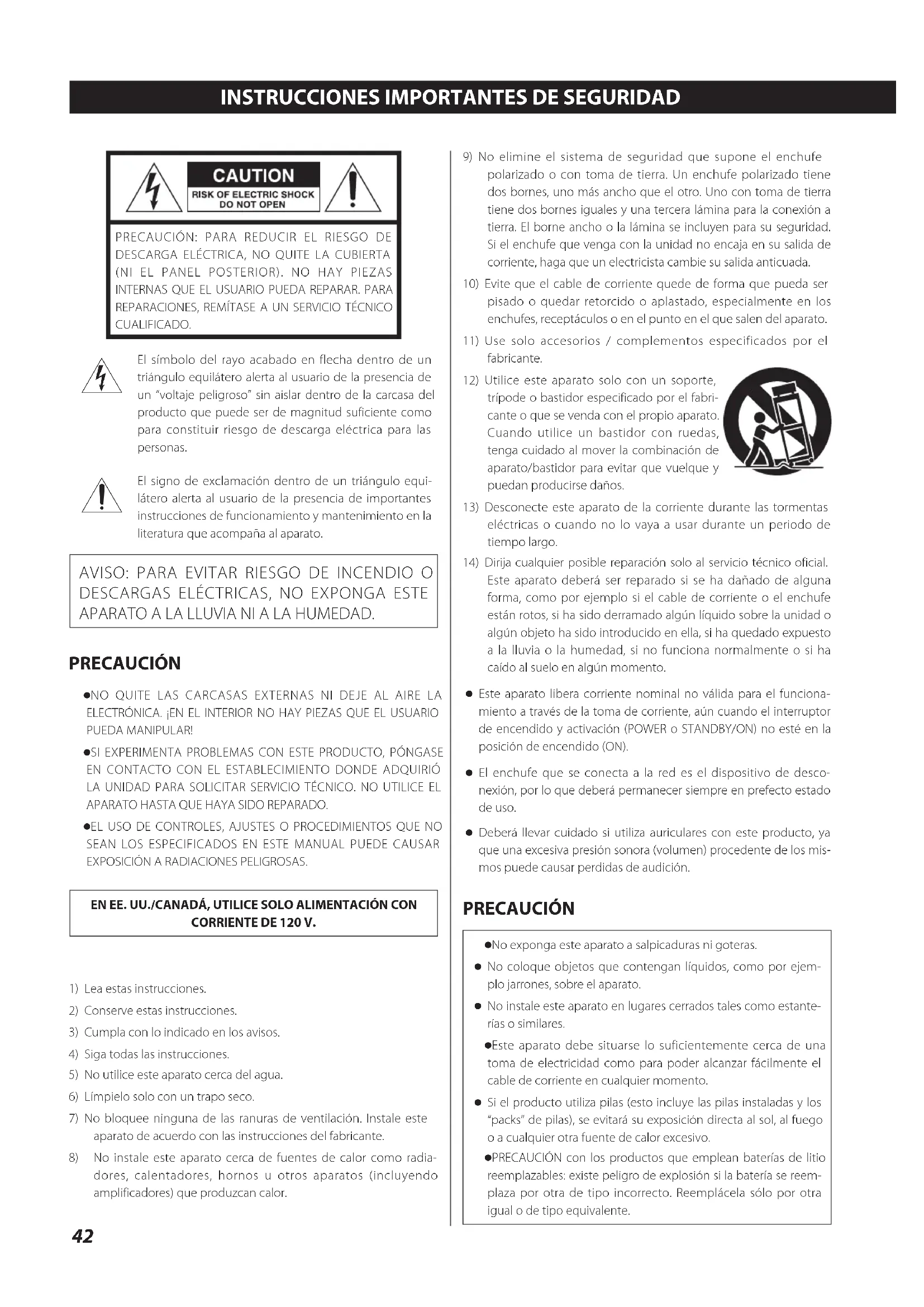 APARATO A LA LLUVIA NI A LA HUMEDAD. PRECAUCIÓN o NO QUITE LAS CARCASAS EXTERNAS NI DEJE AL AIRE LA ELECTRÓNICA. ¡EN EL INTERIOR NO HAY PIEZAS QUE EL USUARIO PUEDA MANIPULAR! o SI EXPERIMENTA PROBLEMAS CON ESTE PRODUCTO, PÓNGASE EN CONTACTO CON EL ESTABLECIMIENTO DONDE ADQUIRIÓ LA UNIDAD PARA SOLICITAR SERVICIO TÉCNICO. NO UTILICE EL APARATO HASTA QUE HAYA SIDO REPARADO. o EL USO DE CONTROLES, AJUSTES O PROCEDIMIENTOS QUE NO SEAN LOS ESPECIFICADOS EN ESTE MANUAL PUEDE CAUSAR EXPOSICIÓN A RADIACIONES PELIGROSAS.EN EE. UU./CANADÁ, UTILICE SOLO ALIMENTACIÓN CON CORRIENTE DE 120 V.1) Lea estas instrucciones.2) Conserve estas instrucciones.3) Cumpla con lo indicado en los avisos.4) Siga todas las instrucciones.5) No utilice este aparato cerca del agua.6) Límpielo solo con un trapo seco.7) No bloquee ninguna de las ranuras de ventilación. Instale este aparato de acuerdo con las instrucciones del fabricante.