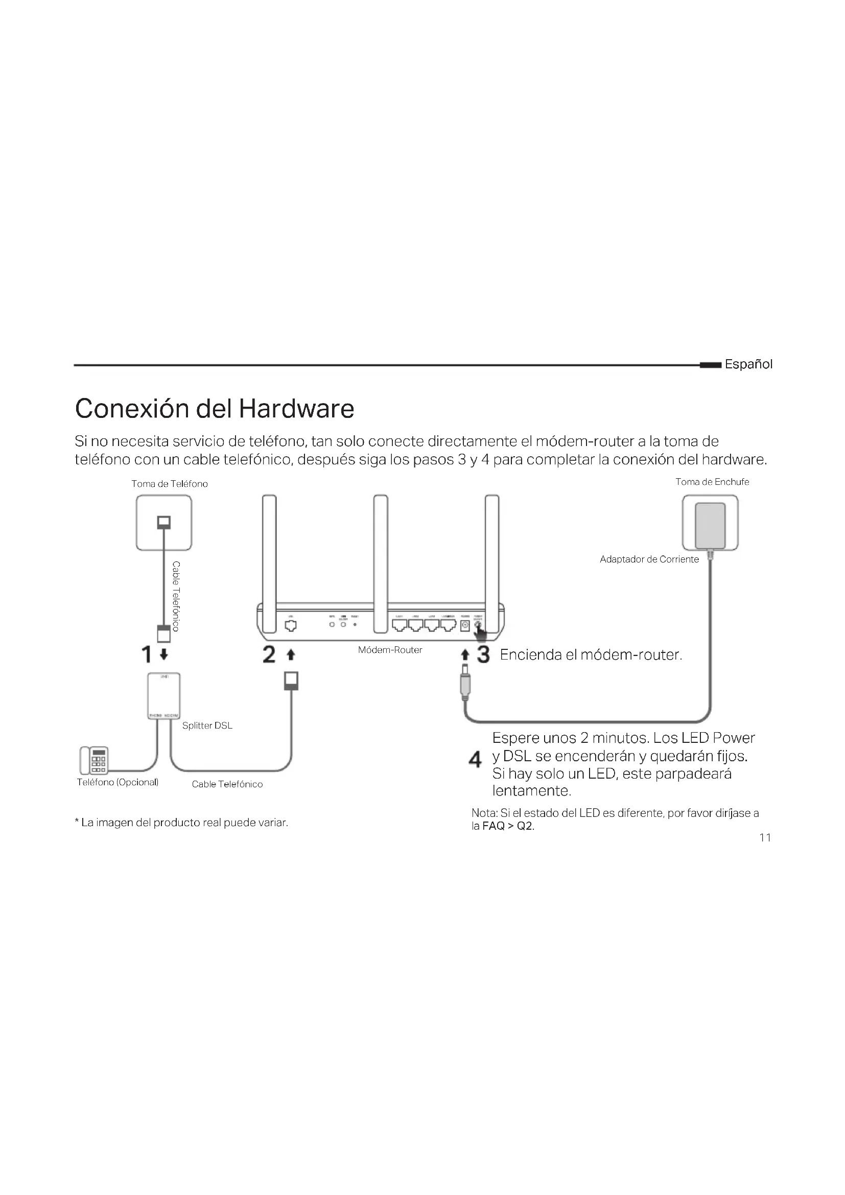 - La imagen del producto real puede variar. Nota: Si el estado del LED es diferente, por favor diríjase a la FAQ > Q2. Espere unos 2 minutos. Los LED Power y DSL se encenderán y quedarán jos. Si hay solo un LED, este parpadeará lentamente. Toma de Teléfono Cable Telefónico Módem-Router Encienda el módem-router. Toma de Enchufe Splitter DSL Teléfono (Opcional) Cable Telefónico Adaptador de CorrienteEspañol