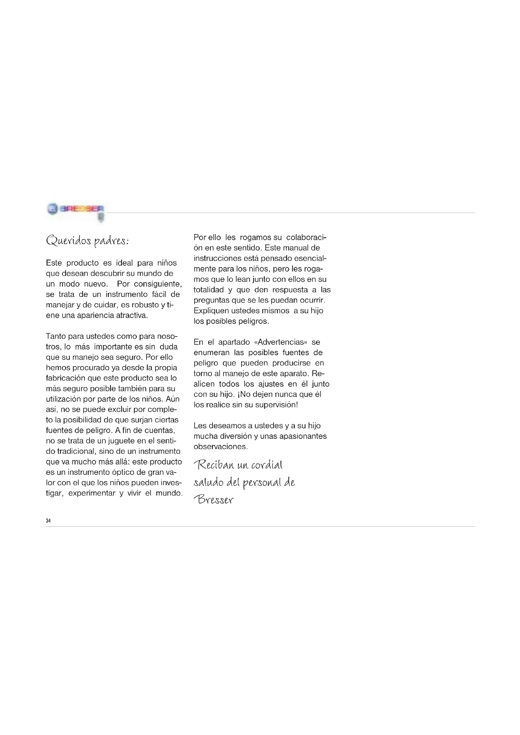 ¡Querido investigador junior! ¡Queri- da investigadora junior! Te has comprado este producto o alguien te lo ha regalado, así que en primer lugar me gustaría darte la en- horabuena. Según vayas leyendo este manual de instrucciones seguro que te que- darás asombrado de todas las cosas para las que sirve este aparato y todo lo que puedes descubrir con él. Convéncete por ti mismo y sumérge- te de lleno en el mundo de las expe- riencias y los descubrimientos en la naturaleza. Es apasionante experimentar el mundo con este producto: ¡una pasada! Sin embargo, antes de poner el aparato en funcionamiento debes leer con atención este manual en su totalidad. Hay algunos aspectos es- pecialmente importantes que debes conocer antes de realizar tus prime- ras observaciones. ¡Por favor, lee con especial atención el apartado «Advertencias»! Utiliza el producto sólo de la manera que se indica en este manual de instruc- ciones para que no se produzcan heridas o daños de manera fortuita. Conserva este manual para que lo puedas consultar más adelante. Si le dejas a alguien el aparato o si lo re- galas, no te olvides de incluir también este manual. Ahora sólo me queda desearte mucha diversión investigando y des- cubriendo el mundo. Con cariño, Pia36 ¡PELIGRO para su hijo! A menudo, para trabajar con este aparato es necesario uti- lizar instrumentos cortantes o pun- tiagudos. Por consiguiente, guarde este aparato junto con todos sus accesorios e instrumentos en un lu- gar que esté fuera del alcance de los niños. ¡Existe PELIGRO DE PROVO- CARSE HERIDAS! Este aparato incluye componentes electrónicos operados a través de una fuente de electricidad (equipo de alimentación y/o pilas). ¡No deje que los niños manejen nunca el aparato sin su supervisión! ¡Sólo se puede utilizar tal como se indica en el manual de instrucciones, ya que en caso contrario existe PELIGRO de una DESCARGA ELÉCTRICA! ¡Las pilas no deben llegar a manos de los niños! Al introducir las pilas, pres- te siempre atención a que la polari- dad sea correcta. Las pilas agotadas o defectuosas pueden provocar que- maduras si entran en contacto con la piel. Dado el caso, utilice guantes de protección adecuados. Los niños sólo pueden usar el apa- rato bajo la supervisión de un adul- to. ¡Mantener fuera del alcance de los niños los materiales de embalaje (bolsas de plástico, cintas de goma, etc.)! ¡Existe PELIGRO DE ASFIXIA!