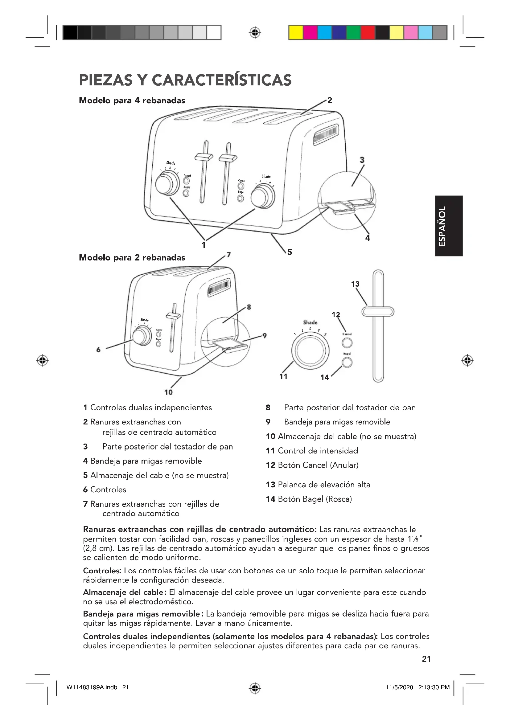 Bandeja para migas removable: La bandeja removable para migas se desliza hacia fuera para quitar las migas rápidamente. Lavar a mano únicamente.