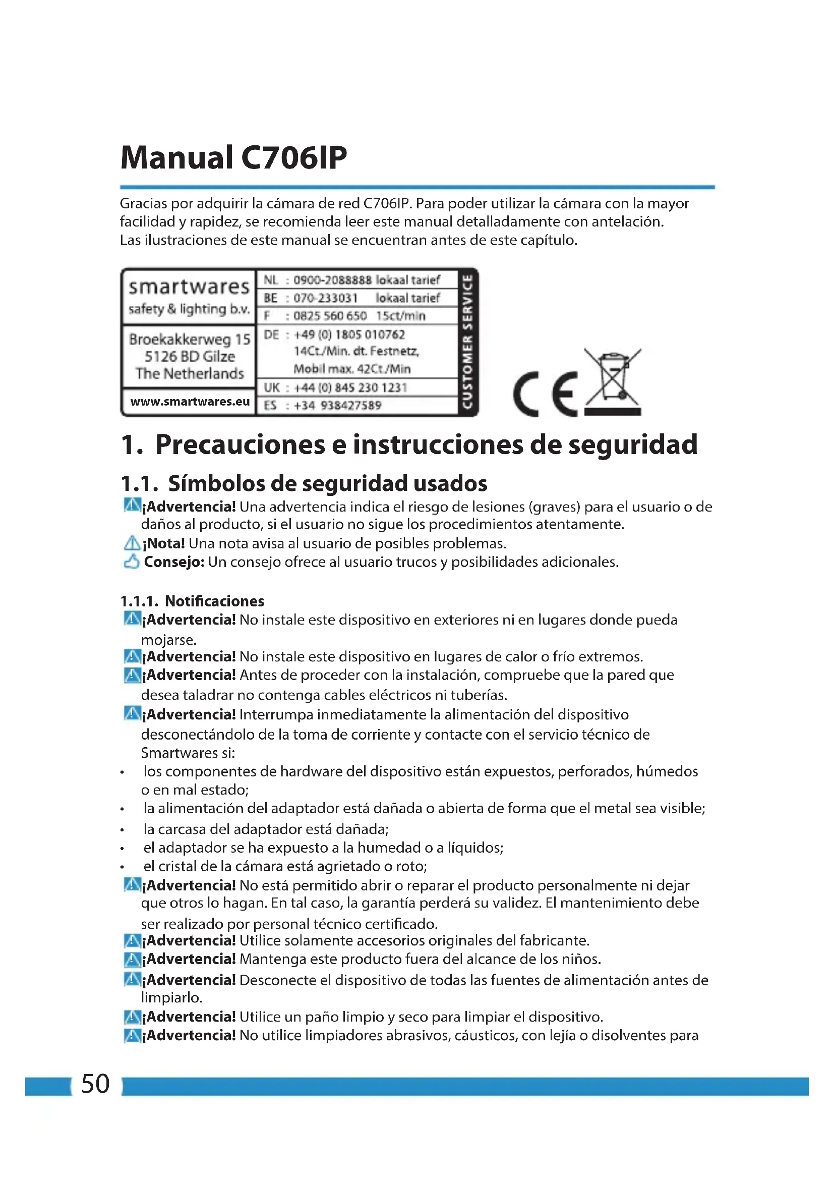 Cet appareil bénécie d'une garantie limitée de 3 ans. Pour connaître toutes les conditions de la garantie, surfez sur: www.smartwares.eu.50 Manual C706IP Gracias por adquirir la cámara de red C706IP. Para poder utilizar la cámara con la mayor facilidad y rapidez, se recomienda leer este manual detalladamente con antelación. Las ilustraciones de este manual se encuentran antes de este capítulo. www.smartwares.eu