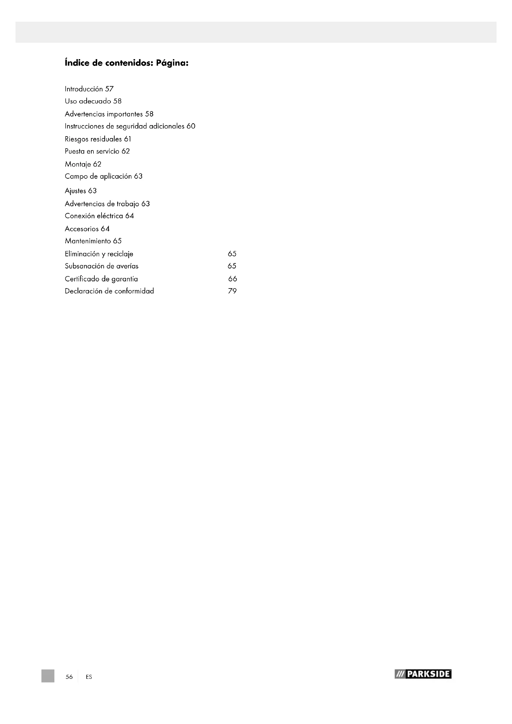 Índice de contenidos: Página: Introducción 57 Uso adecuado 58 Advertencias importantes 58 Instrucciones de seguridad adicionales 60 Riesgos residuales 61 Puesta en servicio 62 Montaje 62 Campo de aplicación 63 Ajustes 63 Advertencias de trabajo 63 Conexión eléctrica 64 Accesorios 64 Mantenimiento 65 Eliminación y reciclaje 65 Subsanación de averías 65 Certificado de garantía 66 Declaración de conformidad 79ES