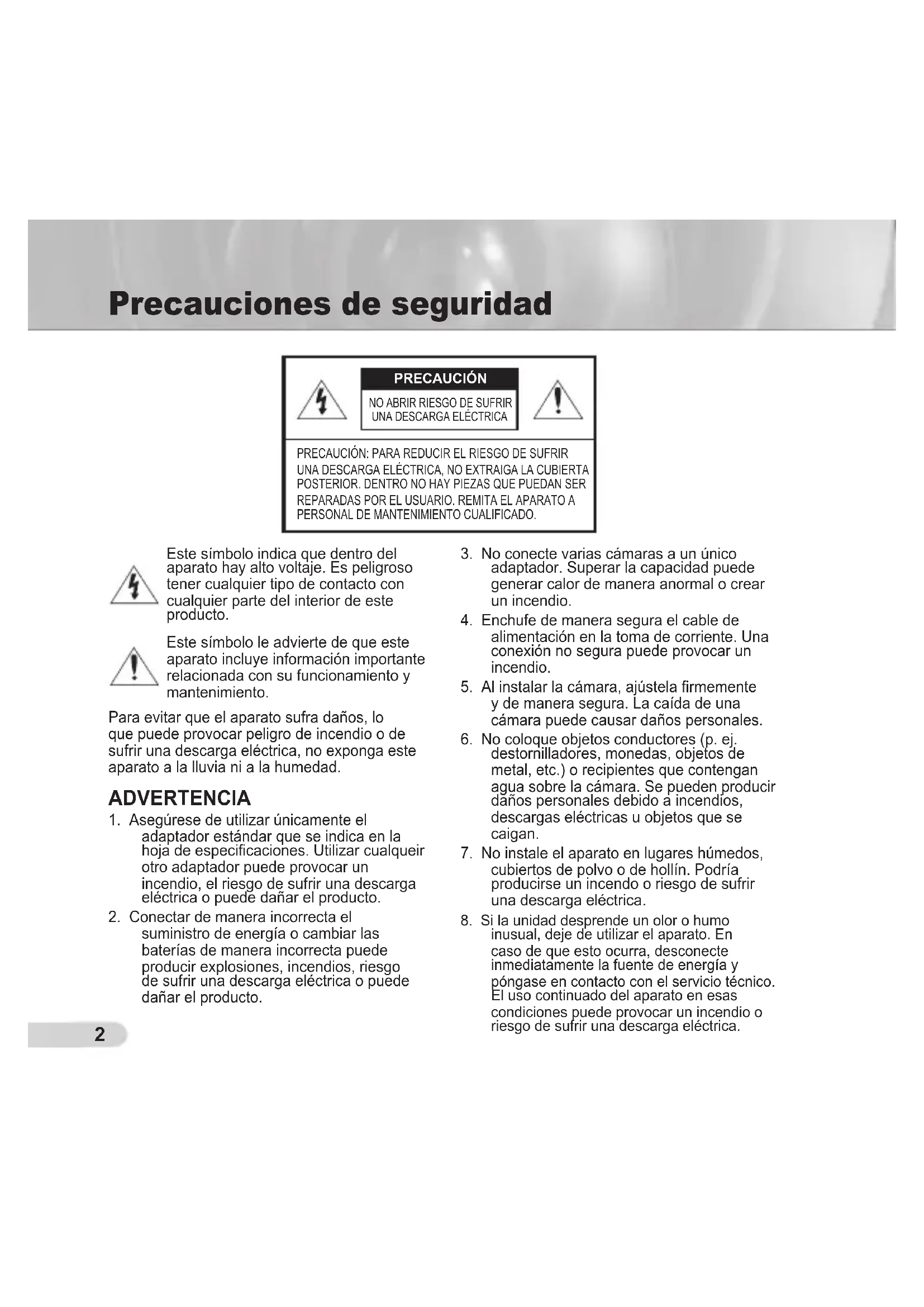 9. Si este producto deja de funcionar con normalidad, póngase en contacto con el servicio técnico más cercano. Nunca intente desmontar o modificar este producto de ninguna manera. (SAMSUNG no se hace responsable de los problemas producidos por modificaciones no autorizadas o por intentos de reparaciones.)10. Al limpiar el producto, no rocíe sus piezas directamente con agua. Podría producirse un incendo o el riesgo de sufrir una descarga eléctrica. PRECAUCIÓN 1. No deje objetos sobre el producto ni aplique una fuerte presión sobre él. Manténgalo lejos de lugares sujetos una demasiadas vibraciones o a interferencias magnéticas. 2. Si desea cambiar de ubicación el aparato ya instalado, asegúrese de desconectar el suministro de energía. Una vez esté desconectado, mueva el aparato o vuelva a instalarlo. 3. Desconecte el enchufe de la toma de corriente cuando hay rayos. Si no lo hace, puede producirse un incendio o el aparato puede dañarse.4. Mantenga el aparato alejado de la luz solar directa y de las fuentes que irradien calor. Se puede producir un incendio.5. Instale el aparato en un lugar bien ventilado.6. Evite dirigir la cámara directamente hacia objetos extremadamente brillantes como, por ejemplo, el sol, puesto que puede dañar el sensor de imagen CCD.7. No debe exponer el aparato a gotas ni salpicaduras de agua ni a objetos con líquido, como jarrones, evitando colocarlos sobre el aparato.8. El enchufe principal se utiliza como un dispositivo de desconexión y debe tenerlo a mano en cualquier momento. Declaración de la Comisión Federal de Comunicaciones de Estados Unidos de América (FCC) Este aparato cumple con la parte 15 de la normativa de la FCC. El funcionamiento está sujeto a las dos condiciones siguientes:1) Este aparato no puede producir interferencias perjudiciales y2) Este aparato debe aceptar cualquier interferencia recibida, incluidas las interferencias que puedan provocar un funcionamiento incorrecto. Nota Este aparato ha sido probado y se ha determinado que se encuentra dentro de los límites para ser clasificado como un aparato digital de Clase A, de conformidad a la parte 15 de la normativa de la FCC. Estos límites se han fijado para ofrecer protección suficiente contra las interferencias perjudiciales cuando el equipo está en funcionamiento en un entorno comercial. Este aparato genera, utiliza y puede irradiar energía por radiofrecuencias y si no es instalado y utilizado siguiendo el manual de instrucciones, puede producir interferencias perjudiciales para las comunicaciones por radio. Es probable que el funcionamiento de este equipo en una zona residencial provoque interferencias perjudiciales. En ese caso, el usuario tendrá que hacerse cargo de los gastos que conlleve corregir la emisión de interferencias. AB68-00687D_Spa.indd 3 2007-08-06 ソタネト 1:54:464