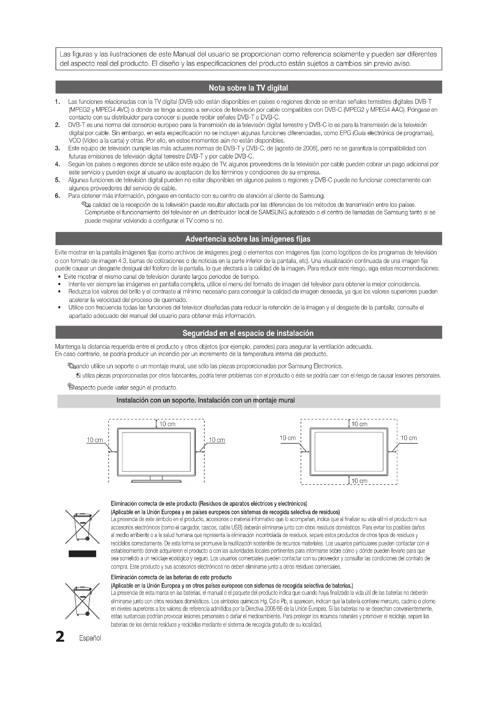 El aspecto puede variar según el producto. Instalación con un soporte. Instalación con un montaje mural Eliminación correcta de este producto (Residuos de aparatos eléctricos y electrónicos) (Aplicable en la Unión Europea y en países europeos con sistemas de recogida selectiva de residuos) La presencia de este símbolo en el producto, accesorios o material informativo que lo acompañan, indica que al finalizar su vida útil ni el producto ni sus accesorios electrónicos (como el cargador, cascos, cable USB) deberán eliminarse junto con otros residuos domésticos. Para evitar los posibles daños al medio ambiente o a la salud humana que representa la eliminación incontrolada de residuos, separe estos productos de otros tipos de residuos y recíclelos correctamente. De esta forma se promueve la reutilización sostenible de recursos materiales. Los usuarios particulares pueden contactar con el establecimiento donde adquirieron el producto o con las autoridades locales pertinentes para informarse sobre cómo y dónde pueden llevarlo para que sea sometido a un reciclaje ecológico y seguro. Los usuarios comerciales pueden contactar con su proveedor y consultar las condiciones del contrato de compra. Este producto y sus accesorios electrónicos no deben eliminarse junto a otros residuos comerciales. Eliminación correcta de las baterías de este producto (Aplicable en la Unión Europea y en otros países europeos con sistemas de recogida selectiva de baterías.) La presencia de esta marca en las baterías, el manual o el paquete del producto indica que cuando haya finalizado la vida útil de las baterías no deberán eliminarse junto con otros residuos domésticos. Los símbolos químicos Hg, Cd o Pb, si aparecen, indican que la batería contiene mercurio, cadmio o plomo en niveles superiores a los valores de referencia admitidos por la Directiva 2006/66 de la Unión Europea. Si las baterías no se desechan convenientemente, estas sustancias podrían provocar lesiones personales o dañar el medioambiente. Para proteger los recursos naturales y promover el reciclaje, separe las baterías de los demás residuos y recíclelas mediante el sistema de recogida gratuito de su localidad. 10 cm 10 cm 10 cm 10 cm 10 cm 10 cm 10 cm [UC6500_XC]BN68-02694A-00L06.indb 2 2010-02-26 오후 11:58:193 ESPAÑOL Español ¡Compruebe este símbolo!