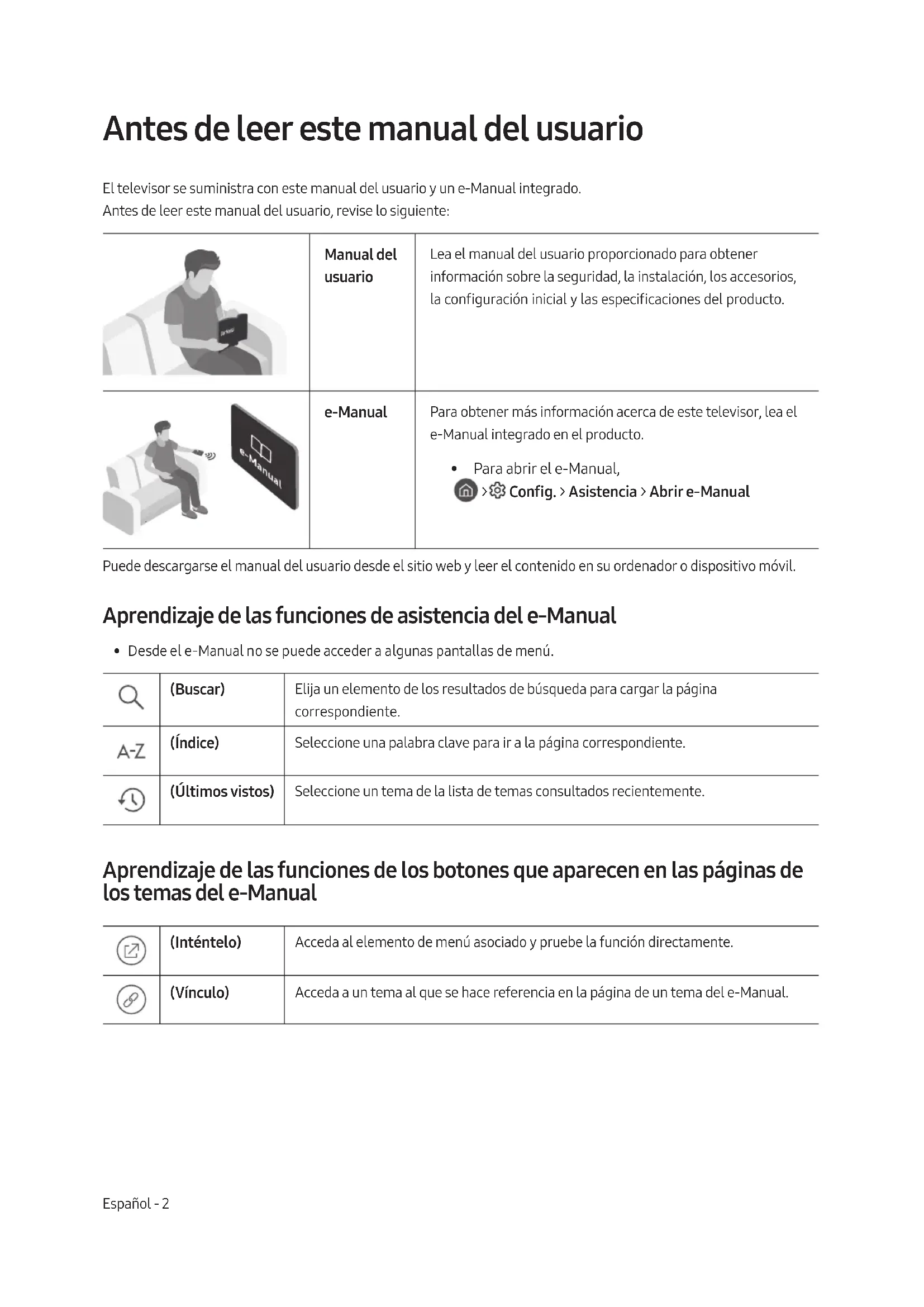 - Para abrir el e-Manual, > Cong. > Asistencia > Abrir e-Manual Puede descargarse el manual del usuario desde el sitio web y leer el contenido en su ordenador o dispositivo móvil. Aprendizaje de las funciones de asistencia del e-Manual
