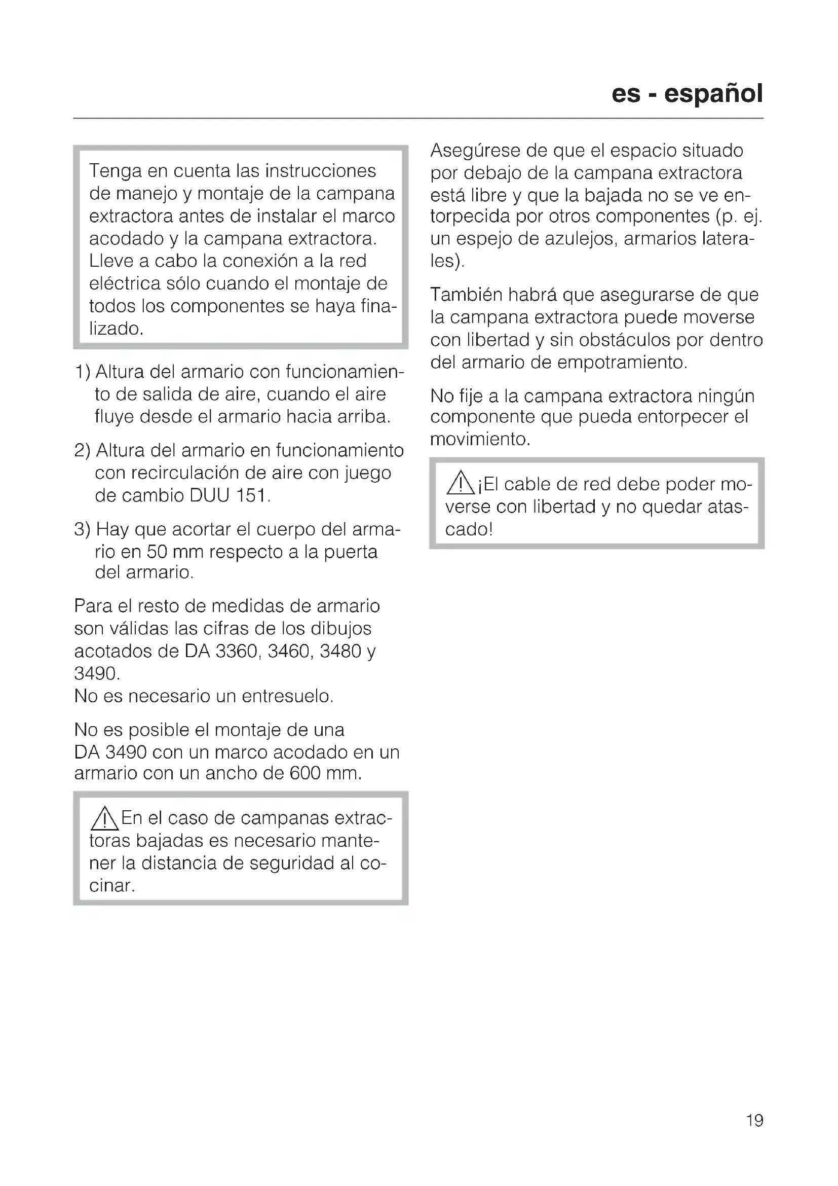 ¡El cable de red debe poder mo- verse con libertad y no quedar atas- cado! es - español 19Montaje ^ Observe los pasos de trabajo para el montaje a partir de la página 26. Los movimientos de plegado y desple- gado de la campana extractora se rea- lizan con la ayuda de dos muelles com- presores. La posición de la fijación superior de- pende del peso de la campana. El peso de la campana varía según la an- chura y el modelo. Cuanto más pese la campana, más ha- cia adelante se debe posicionar la fija- ción. La posición de montaje correcta es im- portante para el plegado y desplegado sin obstáculos de la campana extracto- ra. ^ Posicione los muelles compresores antes del montaje tal y como se des- cribe en los primeros pasos de traba- jo. ^ La bajada de la campana extractora requiere una conexión flexible de la conducción de salida de aire. Para ello utilice la conducción de salida de aire de elevada flexibilidad que se adjunta. es - español 20Manejo A fin de evitar que la parte superior de la visera se pueda arañar con la puerta del mueble, asegúrese de que – al extraer la visera la campana se extrae en primer lugar hacia abajo hasta que encaja, – al levantar la campana primero se introduce la visera hasta el tope. ^ Tire de la campana extractora por el mango hacia abajo hasta que encaje. ^ A continuación extraiga la visera ha- cia delante. La campana extractora se conecta tal y como se describe en las instrucciones de manejo. ^ Vuelva a introducir la visera hasta el tope después de cocinar. La campana extractora se desconecta. ^ Presione después la campana ex- tractora por el mango hacia arriba hasta llegar al tope. es - español 21sv - svenska 22Läs bruks- och monteringsanvis- ningen för fläkten innan du monterar monteringsramen och fläkten. Anslut fläkten och monteringsramen till elnätet först när alla delar är fär- digmonterade.