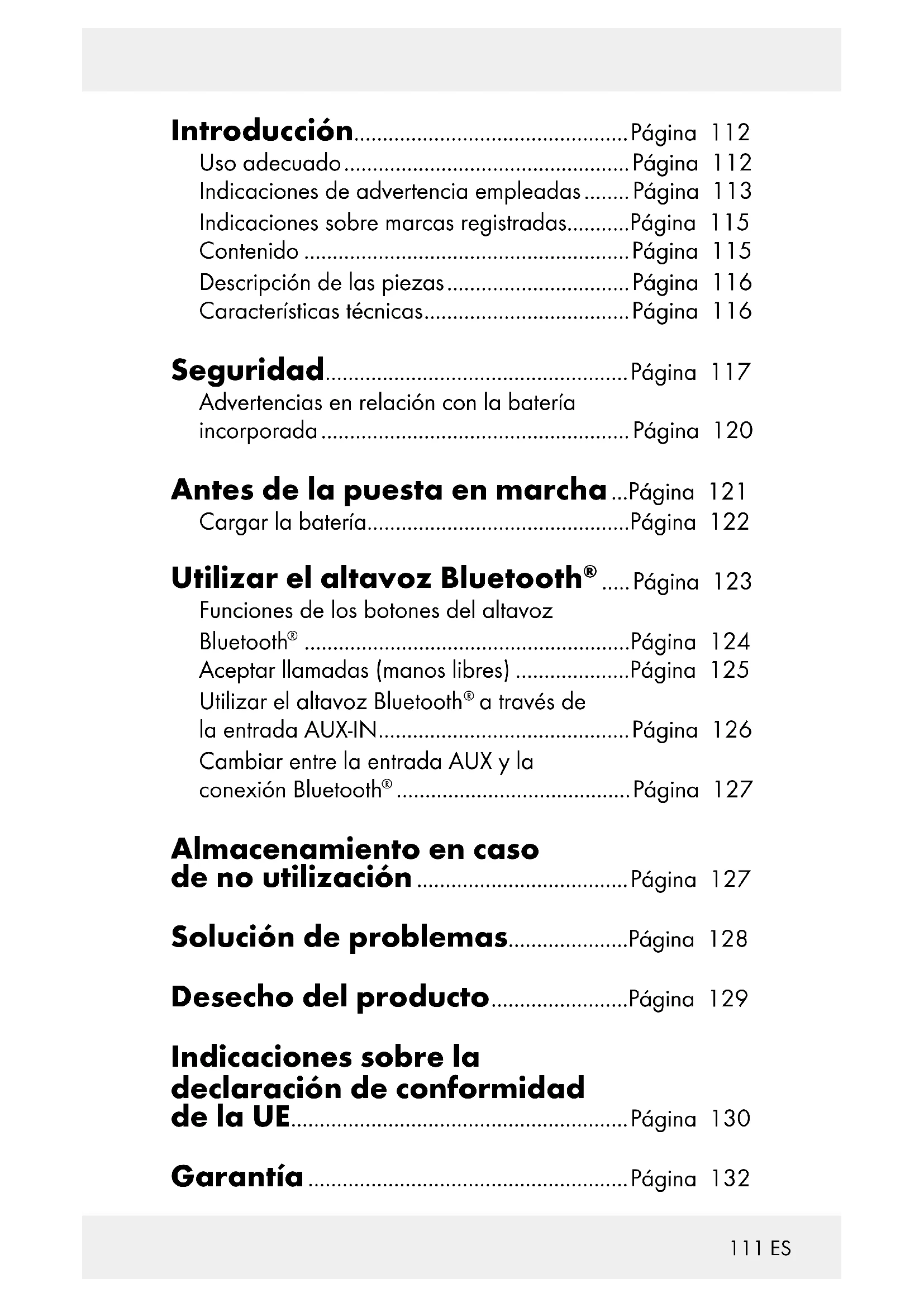 ......................................... Página 127 Almacenamiento en caso de no utilización .....................................Página 127 Solución de problemas .....................Página 128 Desecho del producto ........................Página 129 Indicaciones sobre la declaración de conformidad de la UE ...........................................................Página 130 Garantía ........................................................Página 132112 ES Altavoz Bluetooth