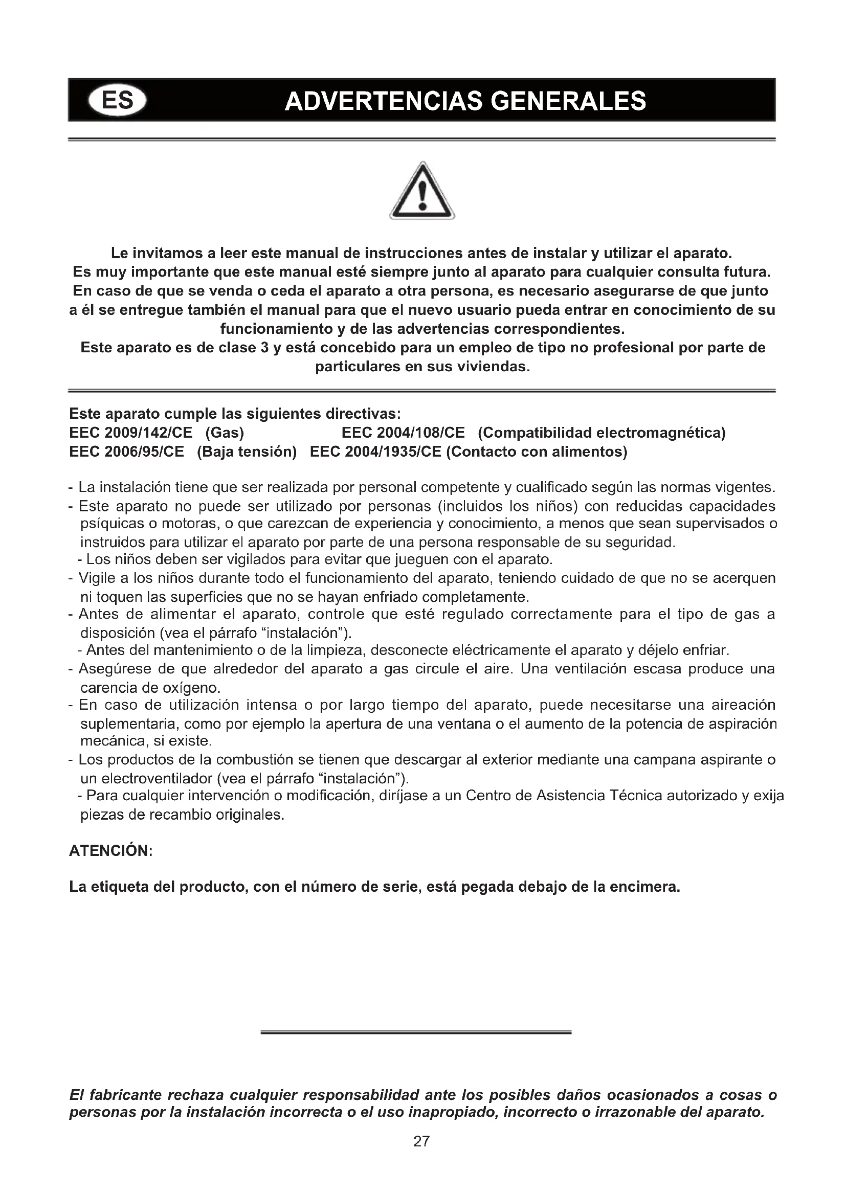 ADVERTENCIAS GENERALES Le invitamos a leer este manual de instrucciones antes de instalar y utilizar el aparato. Es muy importante que este manual esté siempre junto al aparato para cualquier consulta futura. En caso de que se venda o ceda el aparato a otra persona, es necesario asegurarse de que junto a él se entregue también el manual para que el nuevo usuario pueda entrar en conocimiento de su funcionamiento y de las advertencias correspondientes. Este aparato es de clase 3 y está concebido para un empleo de tipo no profesional por parte de particulares en sus viviendas. Este aparato cumple las siguientes directivas: EEC 2009/142/CE (Gas) EEC 2004/108/CE (Compatibilidad electromagnética) EEC 2006/95/CE (Baja tensión) EEC 2004/1935/CE (Contacto con alimentos) - La instalación tiene que ser realizada por personal competente y cualificado según las normas vigentes. - Este aparato no puede ser utilizado por personas (incluidos los niños) con reducidas capacidades psíquicas o motoras, o que carezcan de experiencia y conocimiento, a menos que sean supervisados o instruidos para utilizar el aparato por parte de una persona responsable de su seguridad. - Los niños deben ser vigilados para evitar que jueguen con el aparato. - Vigile a los niños durante todo el funcionamiento del aparato, teniendo cuidado de que no se acerquen ni toquen las superficies que no se hayan enfriado completamente. - Antes de alimentar el aparato, controle que esté regulado correctamente para el tipo de gas a disposición (vea el párrafo “instalación”). - Antes del mantenimiento o de la limpieza, desconecte eléctricamente el aparato y déjelo enfriar. - Asegúrese de que alrededor del aparato a gas circule el aire. Una ventilación escasa produce una carencia de oxígeno. - En caso de utilización intensa o por largo tiempo del aparato, puede necesitarse una aireación suplementaria, como por ejemplo la apertura de una ventana o el aumento de la potencia de aspiración mecánica, si existe. - Los productos de la combustión se tienen que descargar al exterior mediante una campana aspirante o un electroventilador (vea el párrafo “instalación”). - Para cualquier intervención o modificación, diríjase a un Centro de Asistencia Técnica autorizado y exija piezas de recambio originales. ATENCIÓN: La etiqueta del producto, con el número de serie, está pegada debajo de la encimera. El fabricante rechaza cualquier responsabilidad ante los posibles daños ocasionados a cosas o personas por la instalación incorrecta o el uso inapropiado, incorrecto o irrazonable del aparato.28