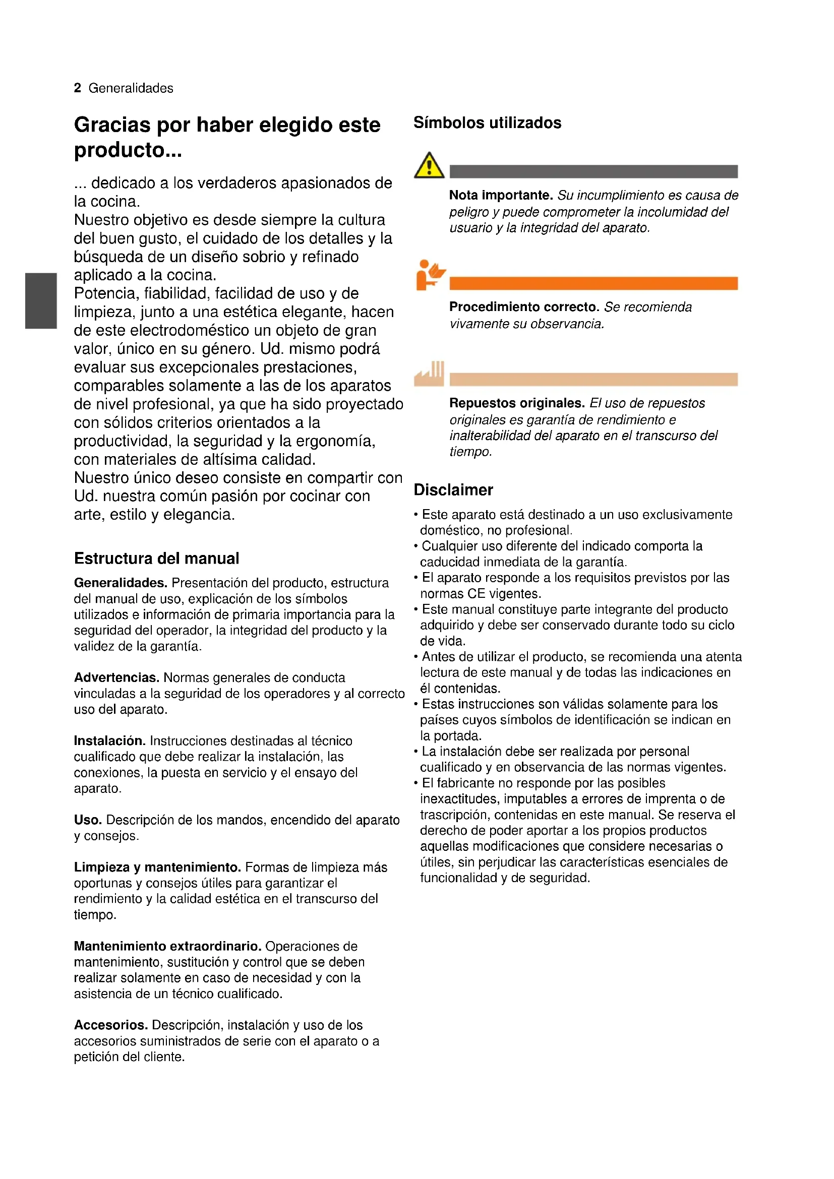 - PROBLEMAS, CAUSAS POSIBLES Y SOLUCIONES RECOMENDADAS Generalidades Gracias por haber elegido este producto dedicado a los verdaderos apasionados de la cocina. Nuestro objetivo es desde siempre la cultura del buen gusto, el cuidado de los detalles y la búsqueda de un diseño sobrio y refinado aplicado a la cocina. Potencia, fiabilidad, facilidad de uso y de limpieza, junto a una estética elegante, hacen de este electrodoméstico un objeto de gran valor, único en su género. Ud. mismo podrá evaluar sus excepcionales prestaciones, comparables solamente a las de los aparatos de nivel profesional, ya que ha sido proyectado con sólidos criterios orientados a la productividad, la seguridad y la ergonomía, con materiales de altísima calidad. Nuestro único deseo consiste en compartir con Ud. nuestra común pasión por cocinar con arte, estilo y elegancia. Estructura del manual Generalidades. Presentación del producto, estructura del manual de uso, explicación de los símbolos utilizados e información de primaria importancia para la seguridad del operador, la integridad del producto y la validez de la garantía. Advertencias. Normas generales de conducta vinculadas a la seguridad de los operadores y al correcto uso del aparato. Instalación. Instrucciones destinadas al técnico cualificado que debe realizar la instalación, las conexiones, la puesta en servicio y el ensayo del aparato. Uso. Descripción de los mandos, encendido del aparato y consejos. Limpieza y mantenimiento. Formas de limpieza más oportunas y consejos útiles para garantizar el rendimiento y la calidad estética en el transcurso del tiempo. Mantenimiento extraordinario. Operaciones de mantenimiento, sustitución y control que se deben realizar solamente en caso de necesidad y con la asistencia de un técnico cualificado. Accesorios. Descripción, instalación y uso de los accesorios suministrados de serie con el aparato o a petición del cliente. Símbolos utilizados Nota importante. Su incumplimiento es causa de peligro y puede comprometer la incolumidad del usuario y la integridad del aparato. Procedimiento correcto. Se recomienda vivamente su observancia. Repuestos originales. El uso de repuestos originales es garantía de rendimiento e inalterabilidad del aparato en el transcurso del tiempo. Disclaimer p. 172