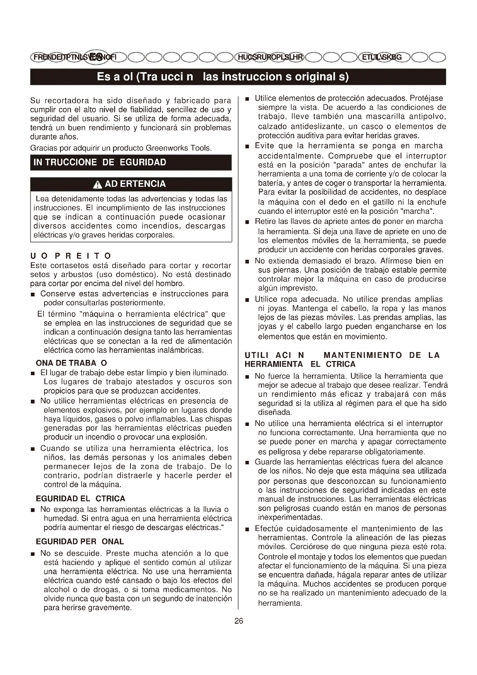 FR EN DE IT PT NL SV DA NO FI HU CS RU RO PL SL HR HU CS RU RO PL SL HR ET LT L V SK BG ET LT LV SK BG Su recortadora ha sido diseñado y fabricado para cumplir con el alto nivel de fiabilidad, sencillez de uso y seguridad del usuario. Si se utiliza de forma adecuada, tendrá un buen rendimiento y funcionará sin problemas durante años. Gracias por adquirir un producto Greenworks Tools.