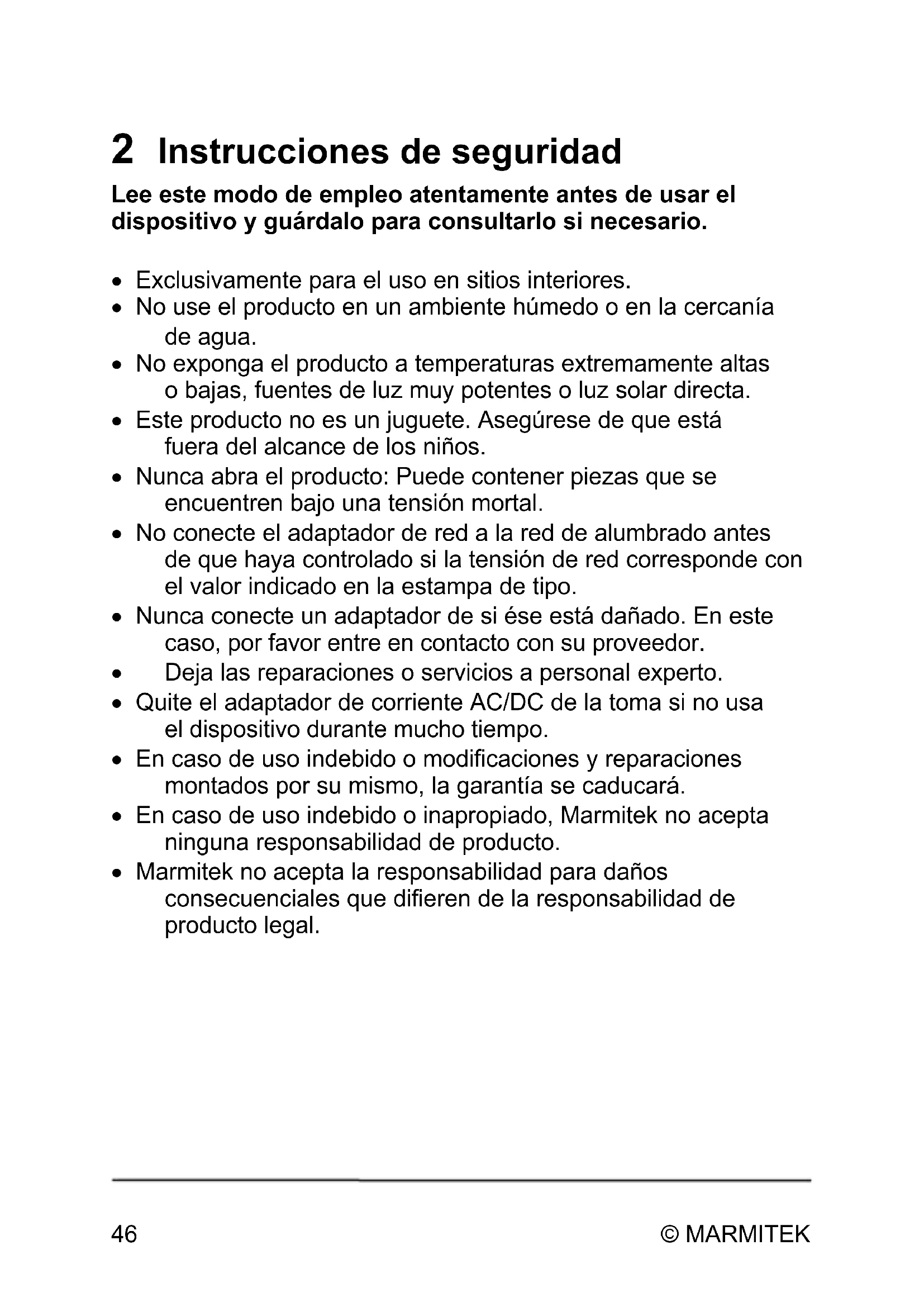 Carcasa Dimensiones (A x A x P) 130 x 75 x19 mm Peso 262 g Ambiente Temperatura ambiental +0 hasta +40° C Humedad ambiental 20 % hasta 90 % Alimentación Adaptador de alimentación externo 100-240 VAC @50-60 Hz, 5 VDC @ 1 A Las especificaciones pueden cambiar sin previo aviso.© MARMITEK