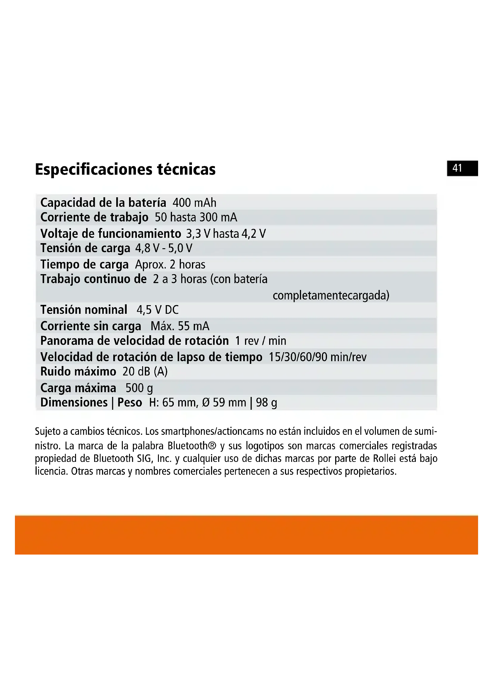 Especificaciones técnicas Capacidad de la batería 400 mAh Corriente de trabajo 50 hasta 300 mA Voltaje de funcionamiento 3,3 V hasta 4,2 V Tensión de carga 4,8 V - 5,0 V Tiempo de carga Aprox. 2 horas Trabajo continuo de 2 a 3 horas (con batería completa mente cargada) Tensión nominal 4,5 V DC Corriente sin carga Máx. 55 mA Panorama de velocidad de rotación 1 rev / min Velocidad de rotación de lapso de tiempo 15/30/60/90 min/rev Ruido máximo 20 dB (A) Carga máxima 500 g Dimensiones | Peso H: 65 mm, Ø 59 mm | 98 g Sujeto a cambios técnicos. Los smartphones/actioncams no están incluidos en el volumen de sumi- nistro. La marca de la palabra Bluetooth® y sus logotipos son marcas comerciales registradas propiedad de Bluetooth SIG, Inc. y cualquier uso de dichas marcas por parte de Rollei está bajo licencia. Otras marcas y nombres comerciales pertenecen a sus respectivos propietarios.42 SPANISH Indicación de estado