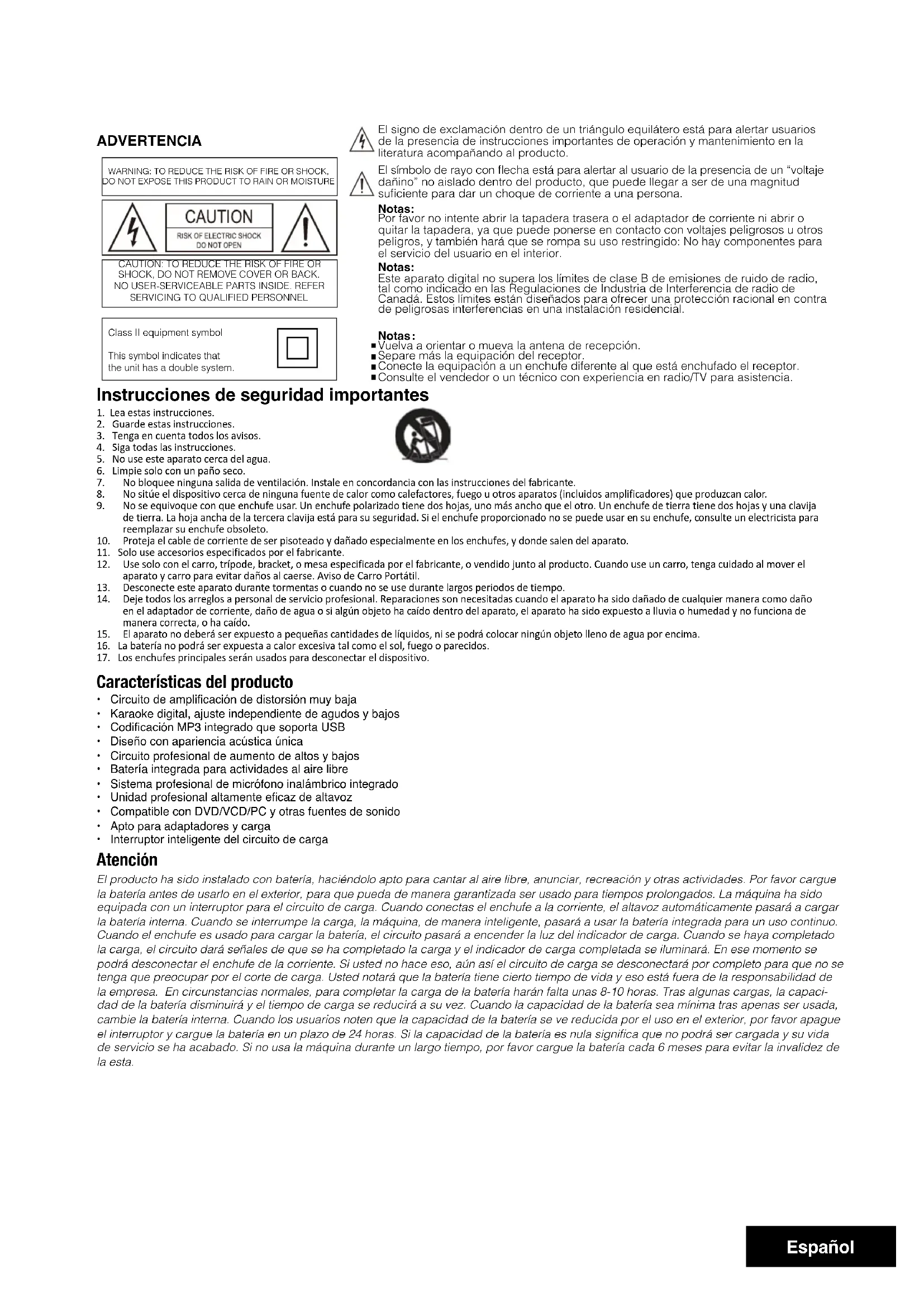 El producto ha sido instalado con bateria, haciendolo apto paracantar al aire libre, annunciari, recreacion y otheras actividades. Por favor cargue la bateria antes de usarlo en el exterior, para que pueda de manera garantizada ser uso para tempos prolongados. Laquina ha sido equipada con un interruptor para el circuito de cargo. Cuando conectas el enchufe a la corrente, el allavoz automatically parazar a carrag la bateria interna. Cuando se interrupme la cargo, laquina, de manera inteligente, pasara a usinga bateria integra de para un uso continu. Cuando el enchufe es usedo para carrar la bateria, el circuito pasara a encender la luz del indicador de cargo. Cuando se haya completado la cargo, el circuito daras einales de que se ha completo la cargo y el indicador de cargo completa de iluminar. En es meomento se podra desconectar el enchufe de la corrente. Si usted no hareeso, ain asel ciurito de cargo se desconectar por completo para que no se tenga que preocupar por el corte de cargo. Usted notarque thatbateriaiene cierto tiempo de vida y esesto fueera de la responsabilitad de la Empresa. En circunstancias normales, para completing la cargo de la bateria haran faltaunas 8-10 horas. Trasalganas cargas,la capacidad de la bateria disminuira y el tempo de cargo se reducir a su vez. Cuando la capacitacion de la bateria sea minima ras apenas ser usability, cambie la bateria interna. Cuando los usarios noten que la capacitacion de la bateria se ve reducida por el uso en el exterior, por favor apague el interruptor y cargue la bateria en un plazo de 24 horas. Si la capacitacion de la bateria es nula significa que no podra ser carrada y su vida de serviceo se ha abaco. Si no usesa la maquina durante un largo time, por favor cargue la bateria cada 6 meses para evitar la invalidez de la esta.