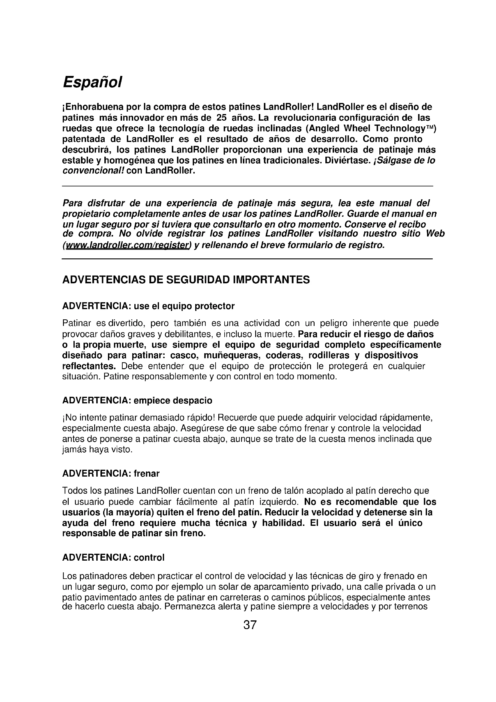 Para disfrutar de una experiencia de patinaje más segura, lea este manual del propietario completamente antes de usar los patines LandRoller. Guarde el manual en un lugar seguro por si tuviera que consultarlo en otro momento. Conserve el recibo de compra. No olvide registrar los patines LandRoller visitando nuestro sitio Web (www.landroller.com/register) y rellenando el breve formulario de registro.