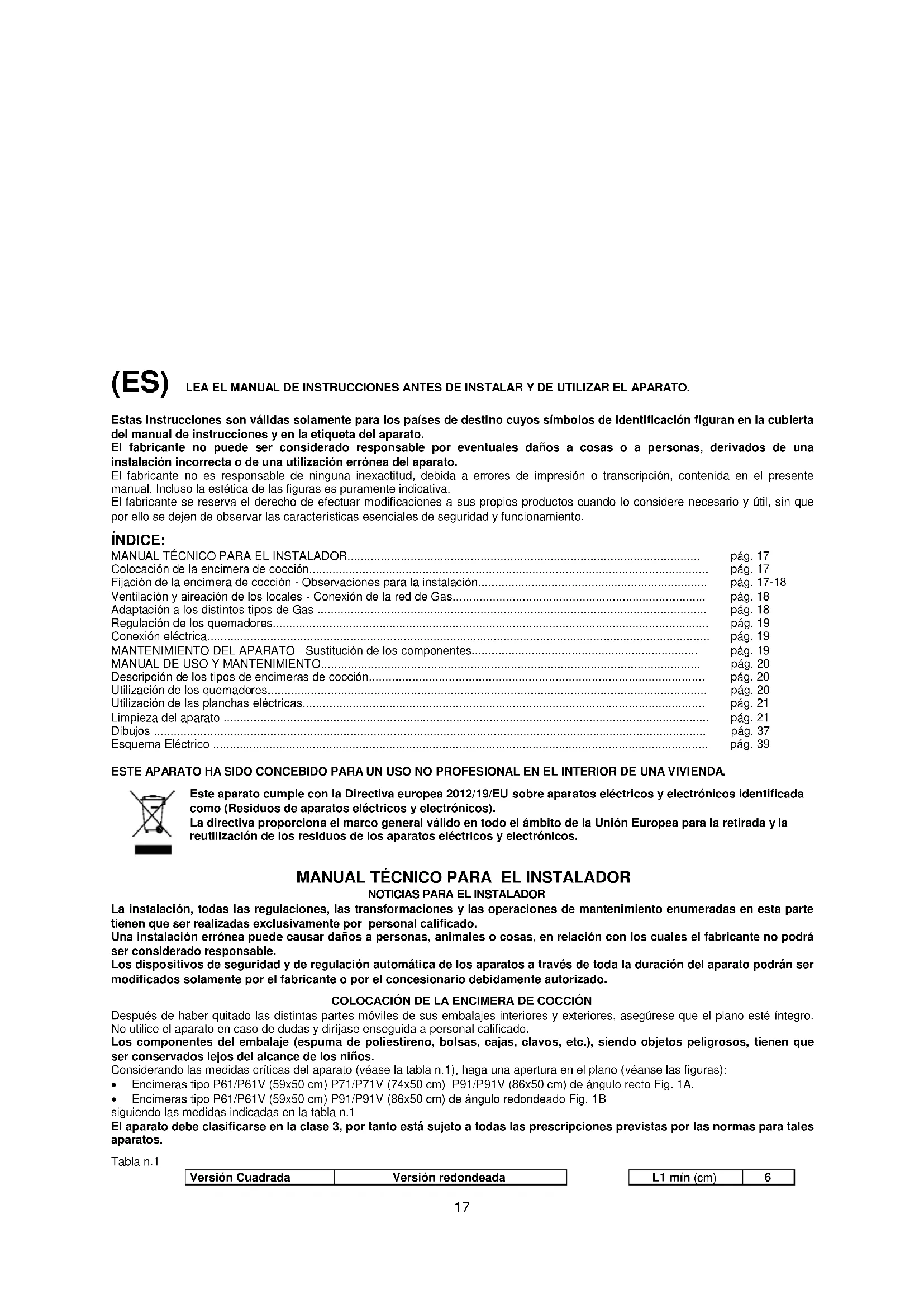 (ES) LEA EL MANUAL DE INSTRUCCIONES ANTES DE INSTALAR Y DE UTILIZAR EL APARATO. Estas instrucciones son válidas solamente para los países de destino cuyos símbolos de identificación figuran en la cubierta del manual de instrucciones y en la etiqueta del aparato. El fabricante no puede ser considerado responsable por eventuales daños a cosas o a personas, derivados de una instalación incorrecta o de una utilización errónea del aparato. El fabricante no es responsable de ninguna inexactitud, debida a errores de impresión o transcripción, contenida en el presente manual. Incluso la estética de las figuras es puramente indicativa. El fabricante se reserva el derecho de efectuar modificaciones a sus propios productos cuando lo considere necesario y útil, sin que por ello se dejen de observar las características esenciales de seguridad y funcionamiento. ÍNDICE: MANUAL TÉCNICO PARA EL INSTALADOR.......................................................................................................... pág. 17 Colocación de la encimera de cocción........................................................................................................................ pág. 17 Fijación de la encimera de cocción - Observaciones para la instalación..................................................................... pág. 17-18 Ventilación y aireación de los locales - Conexión de la red de Gas............................................................................ pág. 18 Adaptación a los distintos tipos de Gas ..................................................................................................................... pág. 18 Regulación de los quemadores................................................................................................................................... pág. 19 Conexión eléctrica....................................................................................................................................................... pág. 19 MANTENIMIENTO DEL APARATO - Sustitución de los componentes.................................................................... pág. 19 MANUAL DE USO Y MANTENIMIENTO.................................................................................................................. pág. 20 Descripción de los tipos de encimeras de cocción..................................................................................................... pág. 20 Utilización de los quemadores.................................................................................................................................... pág. 20 Utilización de las planchas eléctricas......................................................................................................................... pág. 21 Limpieza del aparato .................................................................................................................................................. pág. 21 Dibujos ...................................................................................................................................................................... pág. 37 Esquema Eléctrico ..................................................................................................................................................... pág. 39 ESTE APARATO HA SIDO CONCEBIDO PARA UN USO NO PROFESIONAL EN EL INTERIOR DE UNA VIVIENDA. Este aparato cumple con la Directiva europea 2012/19/EU sobre aparatos eléctricos y electrónicos identificada como (Residuos de aparatos eléctricos y electrónicos). La directiva proporciona el marco general válido en todo el ámbito de la Unión Europea para la retirada y la reutilización de los residuos de los aparatos eléctricos y electrónicos.