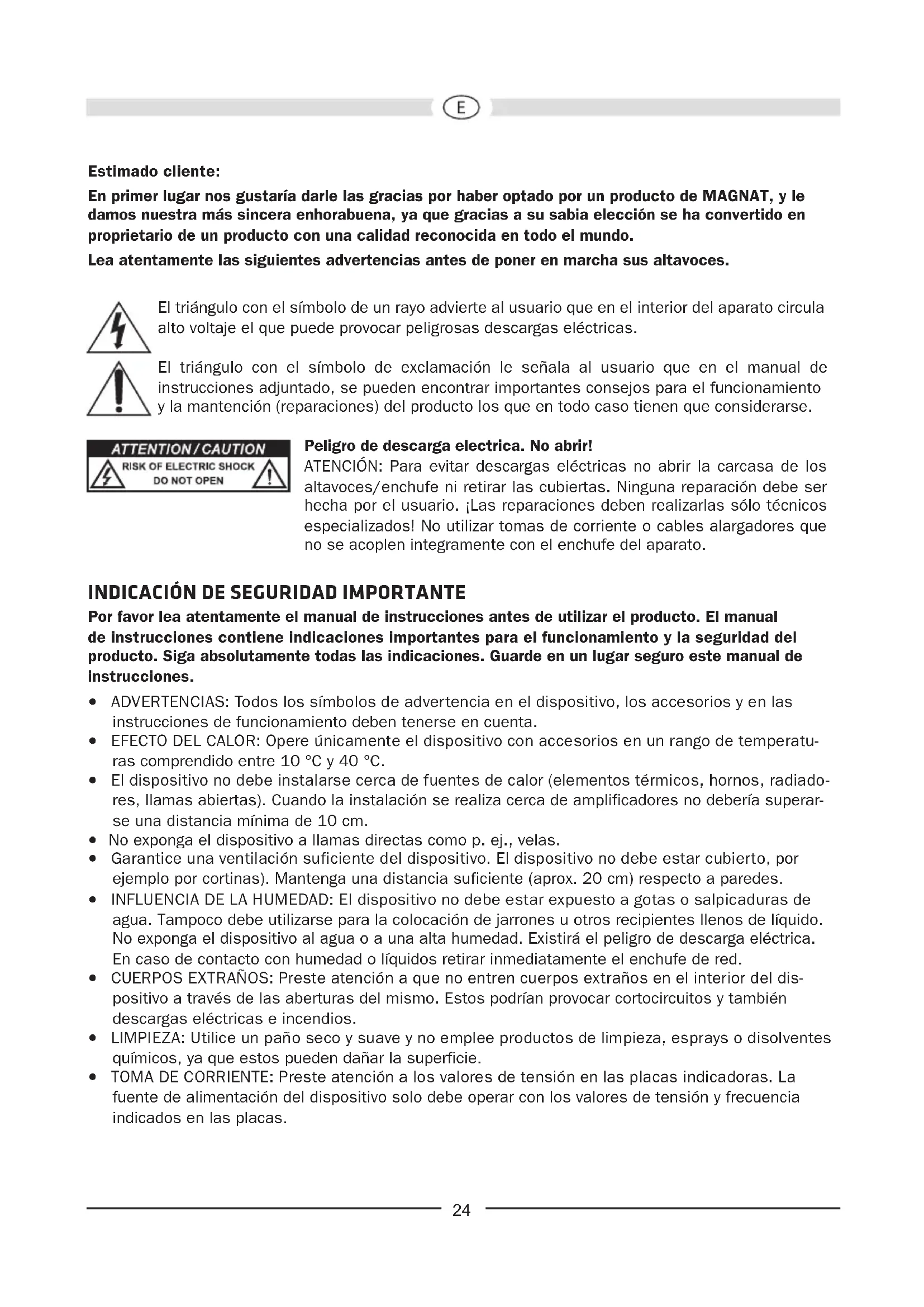 Estimado cliente: En primer lugar nos gustaría darle las gracias por haber optado por un producto de MAGNAT, y le damos nuestra más sincera enhorabuena, ya que gracias a su sabia elección se ha convertido en proprietario de un producto con una calidad reconocida en todo el mundo. Lea atentamente las siguientes advertencias antes de poner en marcha sus altavoces. El triángulo con el símbolo de un rayo advierte al usuario que en el interior del aparato circula alto voltaje el que puede provocar peligrosas descargas eléctricas. El triángulo con el símbolo de exclamación le señala al usuario que en el manual de instrucciones adjuntado, se pueden encontrar importantes consejos para el funcionamiento y la mantención (reparaciones) del producto los que en todo caso tienen que considerarse. Peligro de descarga electrica. No abrir! ATENCIÓN: Para evitar descargas eléctricas no abrir la carcasa de los altavoces/enchufe ni retirar las cubiertas. Ninguna reparación debe ser hecha por el usuario. ¡Las reparaciones deben realizarlas sólo técnicos especializados! No utilizar tomas de corriente o cables alargadores que no se acoplen integramente con el enchufe del aparato.
