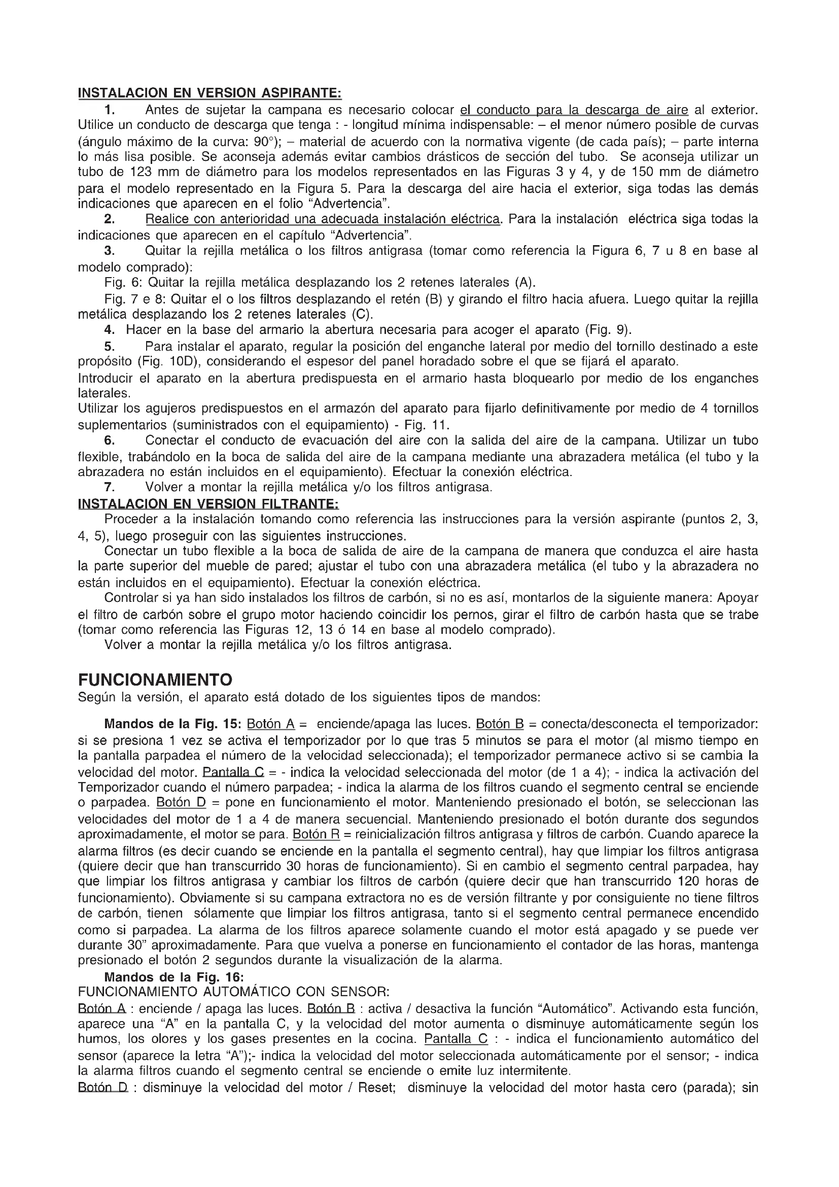 INSTALACION EN VERSION FILTRANTE: Proceder a la instalación tomando como referencia las instrucciones para la versión aspirante (puntos 2, 3, 4, 5), luego proseguir con las siguientes instrucciones. Conectar un tubo fl exible a la boca de salida de aire de la campana de manera que conduzca el aire hasta la parte superior del mueble de pared; ajustar el tubo con una abrazadera metálica (el tubo y la abrazadera no están incluidos en el equipamiento). Efectuar la conexión eléctrica. Controlar si ya han sido instalados los fi ltros de carbón, si no es así, montarlos de la siguiente manera: Apoyar el fi ltro de carbón sobre el grupo motor haciendo coincidir los pernos, girar el fi ltro de carbón hasta que se trabe (tomar como referencia las Figuras 12, 13 ó 14 en base al modelo comprado). Volver a montar la rejilla metálica y/o los fi ltros antigrasa. FUNCIONAMIENTO Según la versión, el aparato está dotado de los siguientes tipos de mandos: Mandos de la Fig. 15: Botón A = enciende/apaga las luces. Botón B = conecta/desconecta el temporizador: si se presiona 1 vez se activa el temporizador por lo que tras 5 minutos se para el motor (al mismo tiempo en la pantalla parpadea el número de la velocidad seleccionada); el temporizador permanece activo si se cambia la velocidad del motor. Pantalla C = - indica la velocidad seleccionada del motor (de 1 a 4); - indica la activación del Temporizador cuando el número parpadea; - indica la alarma de los fi ltros cuando el segmento central se enciende o parpadea. Botón D = pone en funcionamiento el motor. Manteniendo presionado el botón, se seleccionan las velocidades del motor de 1 a 4 de manera secuencial. Manteniendo presionado el botón durante dos segundos aproximadamente, el motor se para. Botón R = reinicialización fi ltros antigrasa y fi ltros de carbón. Cuando aparece la alarma fi ltros (es decir cuando se enciende en la pantalla el segmento central), hay que limpiar los fi ltros antigrasa (quiere decir que han transcurrido 30 horas de funcionamiento). Si en cambio el segmento central parpadea, hay que limpiar los fi ltros antigrasa y cambiar los fi ltros de carbón (quiere decir que han transcurrido 120 horas de funcionamiento). Obviamente si su campana extractora no es de versión fi ltrante y por consiguiente no tiene fi ltros de carbón, tienen sólamente que limpiar los fi ltros antigrasa, tanto si el segmento central permanece encendido como si parpadea. La alarma de los fi ltros aparece solamente cuando el motor está apagado y se puede ver durante 30” aproximadamente. Para que vuelva a ponerse en funcionamiento el contador de las horas, mantenga presionado el botón 2 segundos durante la visualización de la alarma. Mandos de la Fig. 16: FUNCIONAMIENTO AUTOMÁTICO CON SENSOR: Botón A : enciende / apaga las luces. Botón B : activa / desactiva la función “Automático”. Activando esta función, aparece una “A” en la pantalla C, y la velocidad del motor aumenta o disminuye automáticamente según los humos, los olores y los gases presentes en la cocina. Pantalla C : - indica el funcionamiento automático del sensor (aparece la letra “A”);- indica la velocidad del motor seleccionada automáticamente por el sensor; - indica la alarma fi ltros cuando el segmento central se enciende o emite luz intermitente. Botón D : disminuye la velocidad del motor / Reset; disminuye la velocidad del motor hasta cero (parada); sinembargo, tras aproximadamente 1 minuto, la campana volverá a ponerse en funcionamiento automático, a la velocidad determinada por el sensor. Pulsando el botón durante la visualización de la alarma fi ltros, se activa el RESET y, por consiguiente, el cálculo de las horas se repone en marcha. Botón E : aumenta la velocidad del motor; sin embargo, tras aproximadamente 1 minuto, la campana volverá a ponerse en funcionamiento automático, a la velocidad determinada por el sensor. Modifi cación de la sensibilidad del sensor: se puede modifi car la sensibilidad del sensor actuando del modo siguiente: - pare la campana, pulsando el botón B. - Pulse simultáneamente los botones D y E (en la pantalla aparecerá el índice de sensibilidad del sensor). - Pulsando los botones D ó E, aumente o disminuye el índice de sensibilidad del sensor (1 : sensibilidad mínima / 9: sensibilidad máxima). - en caso de interrupción de la alimentación eléctrica, el sensor funcionará de nuevo con sensibilidad 5. ¡Atención: para evitar dañar el sensor, no use productos silicónicos en las cercanías de la campana! Mandos de la Fig. 17: Interruptor A - LUZ; posición 0: luz apagada; posición 1: luz encendida. Interruptor B - VELOCIDAD MOTOR: permite regular las velocidades de funcionamiento del motor; posición 0: motor parado; C : Piloto luminoso de funcionamiento del motor. Mandos de la Fig. 18: Botón A: Enciende/apaga las luces; cada 30 horas de funcionamiento el piloto lumi- noso correspondiente (S) se enciende indicando que es necesario limpiar los fi ltros antigrasa y cada 120 horas se pone intermitente indicando que es necesario limpiar dichos fi ltros y además sustituir el fi ltro de carbón. Para poner a cero (RESET) el cuentahoras, mantener presionado el botón A aproximadamente 1” (mientras el piloto S esté encendido). Botón B: Acciona el motor a la 1ª velocidad (con lo cual se enciende el piloto luminoso cor- respondiente); apaga el motor si se mantiene presionado aproximadamente 1”; si se presiona por segunda vez (durante el encendido del piloto luminoso) se activa el TIMER, con lo cual 5’ después se para el motor y el piloto correspondiente se pone intermitente. Botón C: Acciona el motor a la 2ª velocidad (con lo cual se enciende el piloto luminoso correspondiente); si se presiona por segunda vez (durante el encendido del piloto luminoso) se activa el TIMER, con lo cual 5’ después se para el motor y el piloto correspondiente se pone intermitente. Botón D: Acciona el motor a la