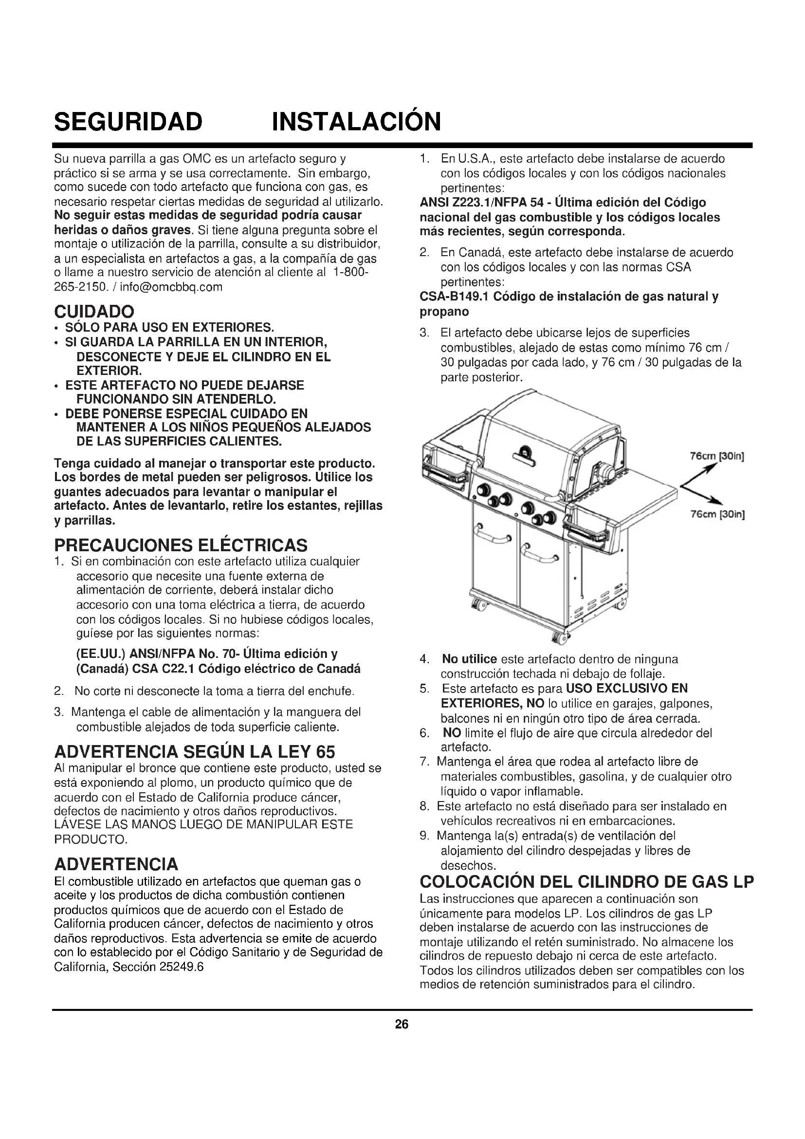- El artefacto debe ubicarse lejos de superficies combustibles, alejado de estas como minimo 76~cm / 30 pulgadas por cada lado, y 76~cm / 30 pulgadas de la parte posterior.