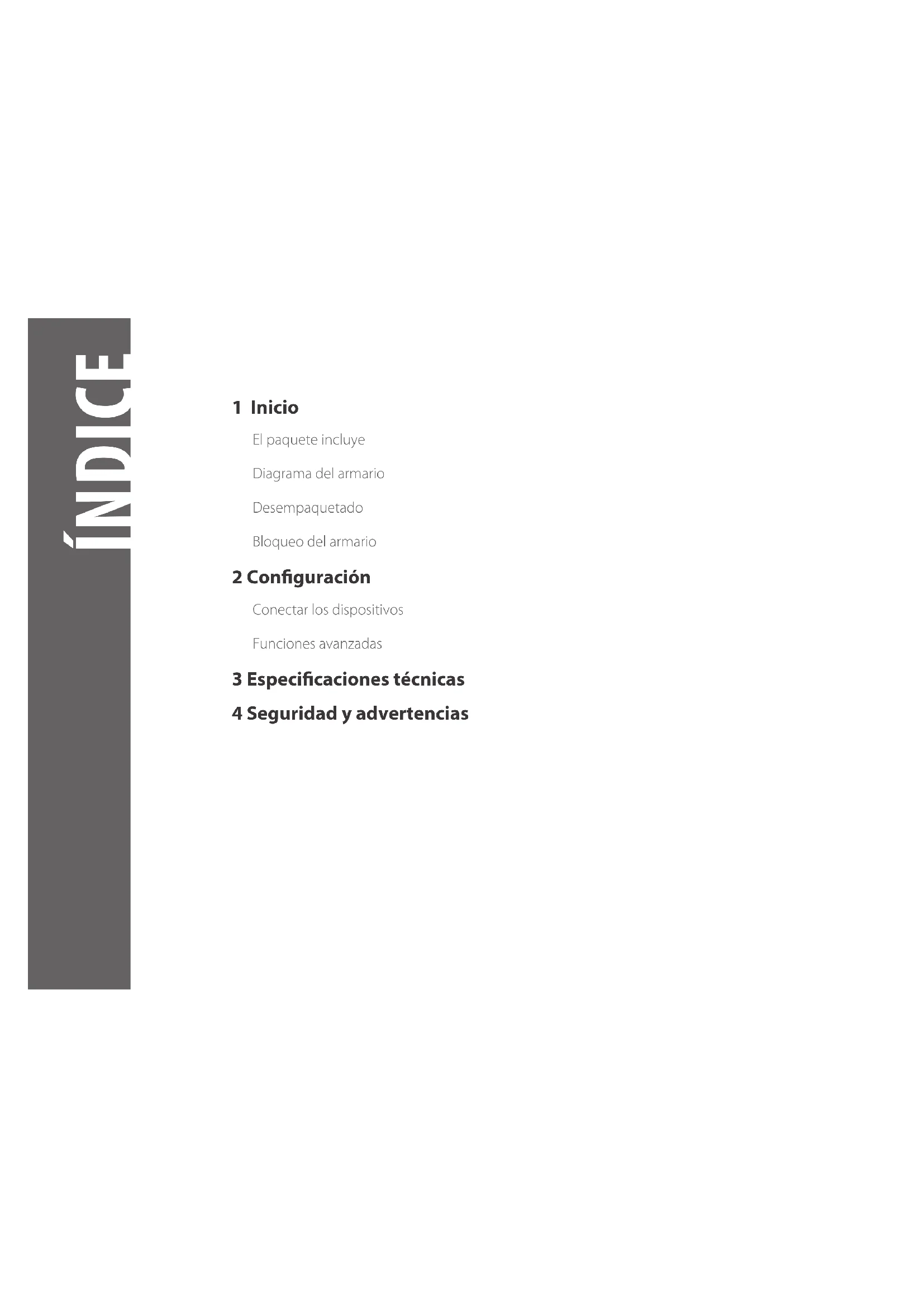 Armario de carga1 Inicio El paquete incluye Diagrama del armario Desempaquetado Bloqueo del armario 2 Conguración Conectar los dispositivos Funciones avanzadas 3 Especicaciones técnicas 4 Seguridad y advertencias ÍNDICE1 INICIO El paquete incluye