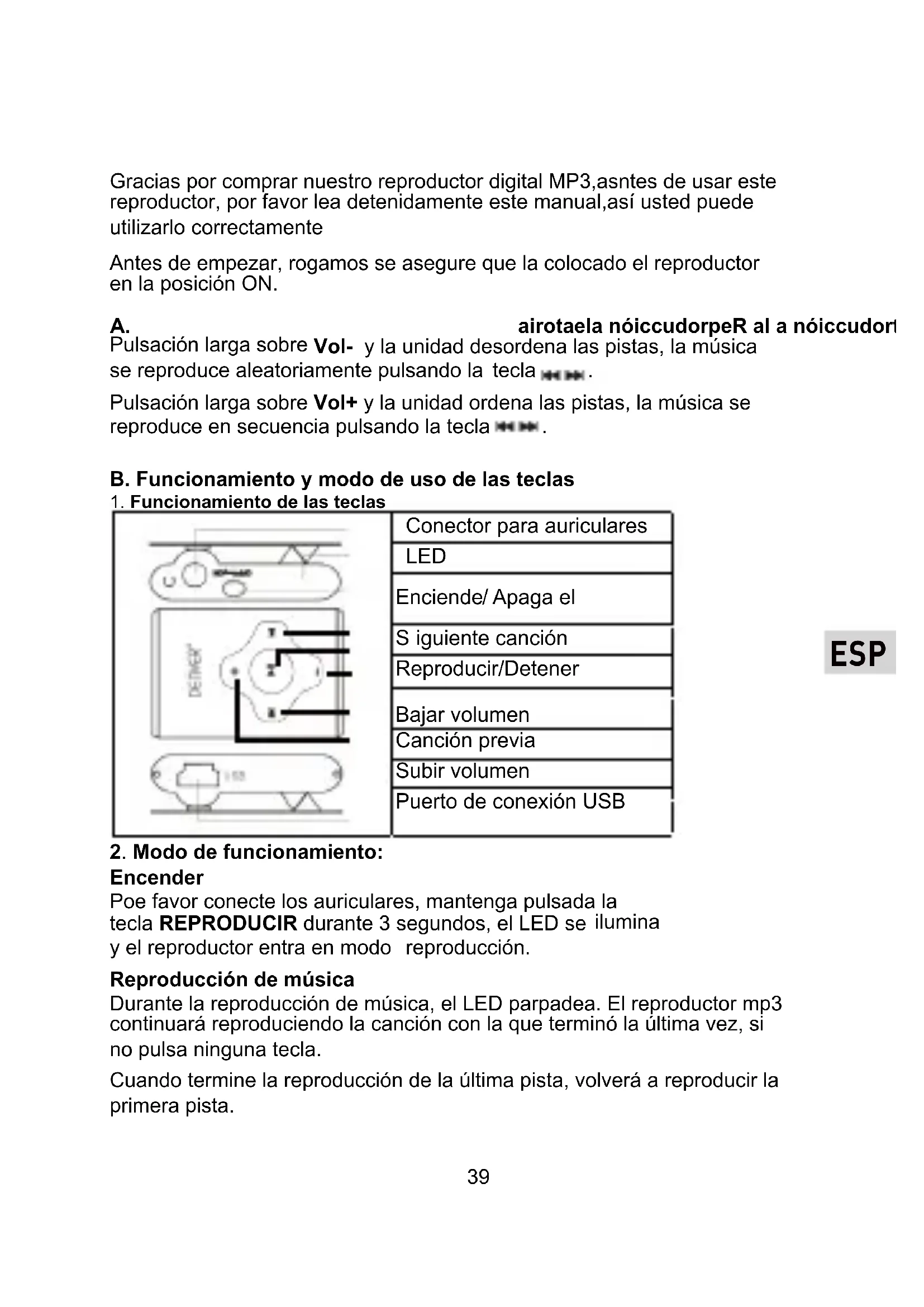 Pulsación larga sobre Vol+ y la unidad ordena las pistas, la música se reproduce en secuencia pulsando la tecla