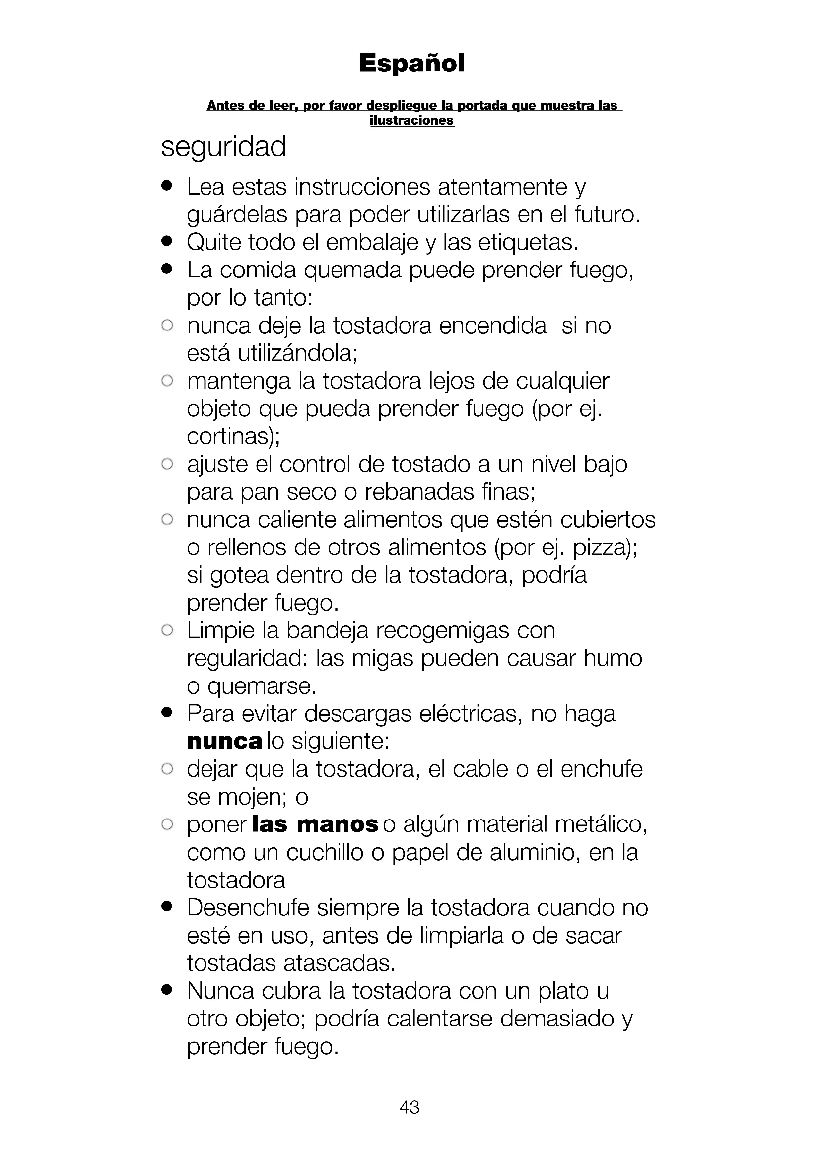 Nunca cubra la tostadora con un plato u otro objeto; podría calentarse demasiado y prender fuego. Antes de leer, por favor despliegue la portada que muestra las ilustracionesEnglish