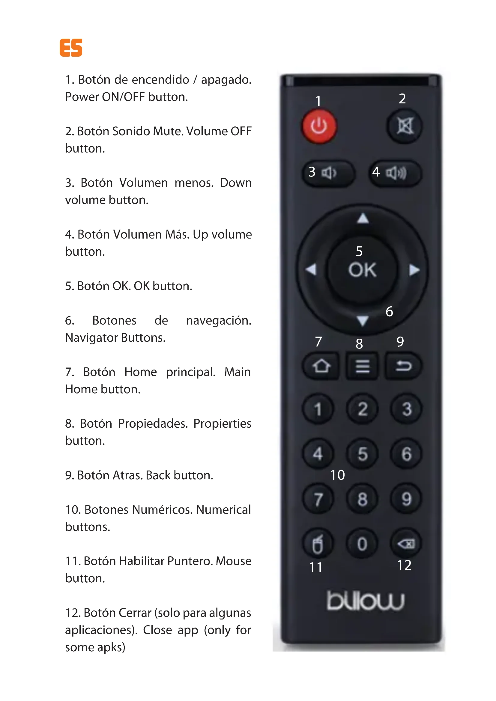 apagado desconectando y conectando el adaptador de corriente. PRIMERA CONFIGURACION Siga los pasos del asistente de conguración para ajustar idioma, fecha/hora, pantalla y redes. ESES HOME PRINCIPAL En la Home principal puede seleccionar todo el contenido del reproductor y congurarlo a su gusto, para añadir iconos de acceso directo pulse el botón + situado en la esquina inferior derecha, se abrirá la lista de aplicaciones y puede seleccionar aplicaciones que se mostrarán en la home principal.ES AJUSTES Si hacemos clic en el icono de ajustes, en el panel lateral izquierdo, accedemos a las principales aplicaciones para ajustes de sistema, para ejecutar alguna de ellas solo tenemos que hacer clic sobre la deseada. Si hacemos clic en el icono Settings (Ajustes), accedemos a los ajustes generales de sistemas, para congurar ajustes como red Wi-Fi, Bluetooth, etcES Si se requiere más ajustes en profundidad haga clic en Más ajustes y se abrirá un panel lateral derecho con todos los ajustes de sistema. APLICACIONES Si hacemos clic en el icono Aplicaciones, se mostraran las aplicaciones instaladas en el sistema y podrá ejecutarlas.ES OTROS Escribir o introducir textos: Abra alguna aplicación tipo navegador, seleccione el cuadro donde desea escribir algo y el teclado virtual se abrirá para escribir cualquier texto. Conectar y leer datos de dispositivos externos Conecte una unidad de almacenamiento externa, ejemplo Pendrive en alguno de los puertos USB del MD10PRO. Abra la aplicación FileBrowser y seleccione la unidad deseada y abra el archivo deseado.ES Conexión WI-FI Haga clic en el icono Ajustes en la Home principal, vuelva a hacer clic en Ajustes. Haga clic en Inalámbrico, haga clic sobre la Wi-Fi deseada de la lista de Redes Disponibles e introduzca la clave de Wi-Fi para conectar correctamente. Conexión Bluetooth Haga clic en el icono Ajustes en la Home principal, vuelva a hacer clic en Ajustes. Haga clic en Inalámbrico, haga clic en Bluetooth, habilite los interruptores en la posición ONES Pulse sobre el botón Ajustes y en Buscar, seleccione el dispositivo a ser emparejado. Introduzca el PIN necesario (generalmente es “0000” o “1234”) para conectarse al dispositivo si es requerido. Nota: Billow Technology NO ES RESPONSABLE, ni propietario de las aplicaciones instaladas, ni de su contenido. Por lo cual el mantenimiento de las mismas es de terceras partes no asociadas a la marca. Soporte técnico. Por favor para más información sobre la instalación y conguración de este producto diríjase a nuestra web www. billowtechnology.comES Reciclado AEE REI-RAEE 5548 En el presente manual, el símbolo del contenedor tachado indica que el producto está sometido a una directiva europea, la 2002/96/EC, los productos eléctricos o electrónicos, las baterías, y los acumuladores y otros accesorios necesariamente han de ser objeto de una recogida selectiva. Al nal de la vida útil del dispositivo, haz uso de los contenedores de reciclaje. Este gesto ayudará a reducir los riesgos para la salud y a preservar el medioambiente.EN Introduction and description of the product. Thank you for choosing the Smart Android TV Box MD10PRO. The MD10PRO is a Smart Android TV Box, designed to turn your television into a next-generation Smart TV. With its 2 Ghz Octa Core processor, its 3GB DDR memory, its 32GB of storage memory, Wi-Fi AC dual band at 2.4Ghz and 5Ghz, Bluetooth 4.1, Gigabit Ethernet and 2 USB 2.0 ports that will give your TV all the potential needed to play or do anything. Its operating system is Android 7.1, which oers unique stability. The MD10PRO, is 4K to 60FPS, HDMI 2.0 and supports the H.265 codec by hardware, so we have guaranteed any current and future video format. Its package of applications is the most complete on the market and will have a host of possibilities and TV on demand. Discover the new way to enjoy your TV! Packing content
