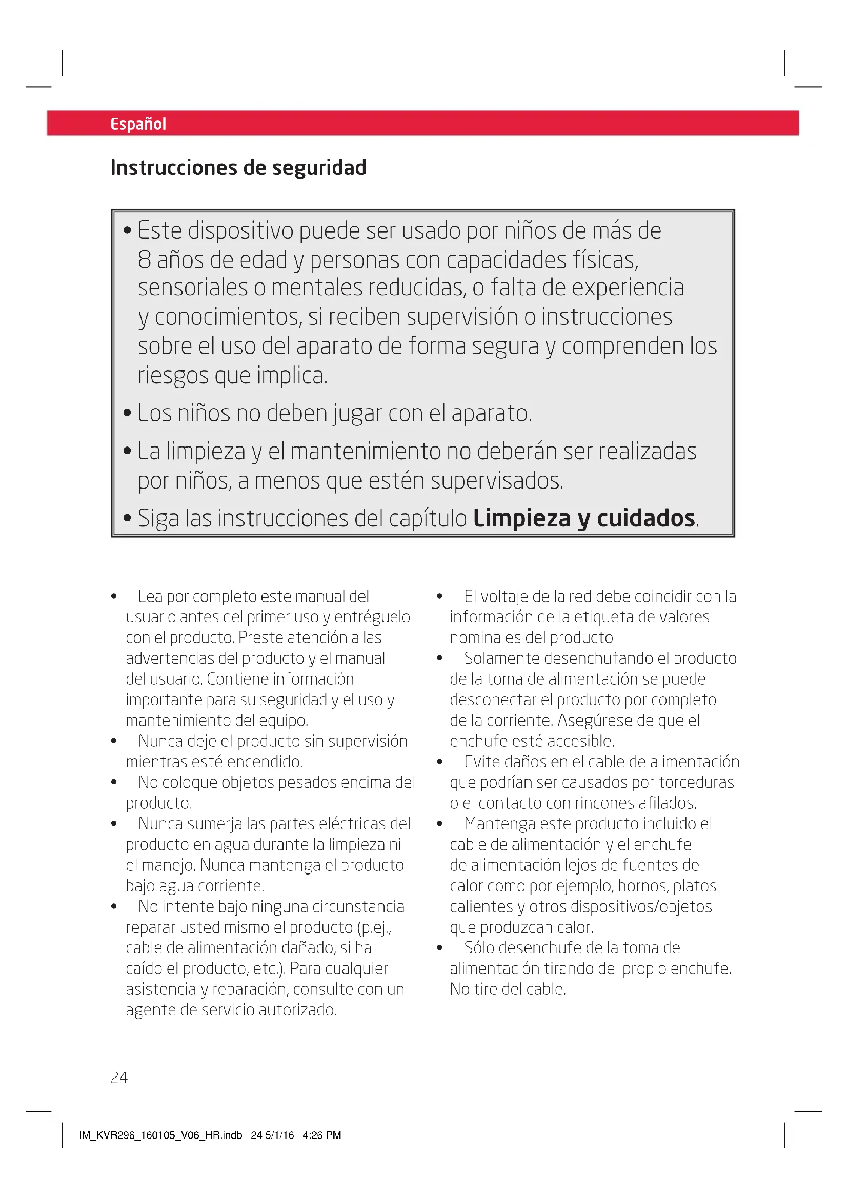 - Sólo desenchufe de la toma de alimentación tirando del propio enchufe. No tire del cable. IM_KVR296_160105_V06_HR.indb 24 5/1/16 4:26 PMEspañol
