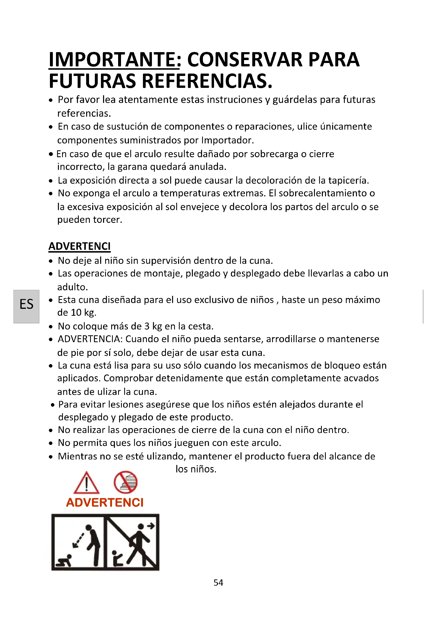 No coloque mas de 3kg en la cesta. - ADVERTENCIA: Cuando el niño pueda sentarse, arrodillarse o mantenerse de pie por si solo, deben estar de usar esta cuna.
