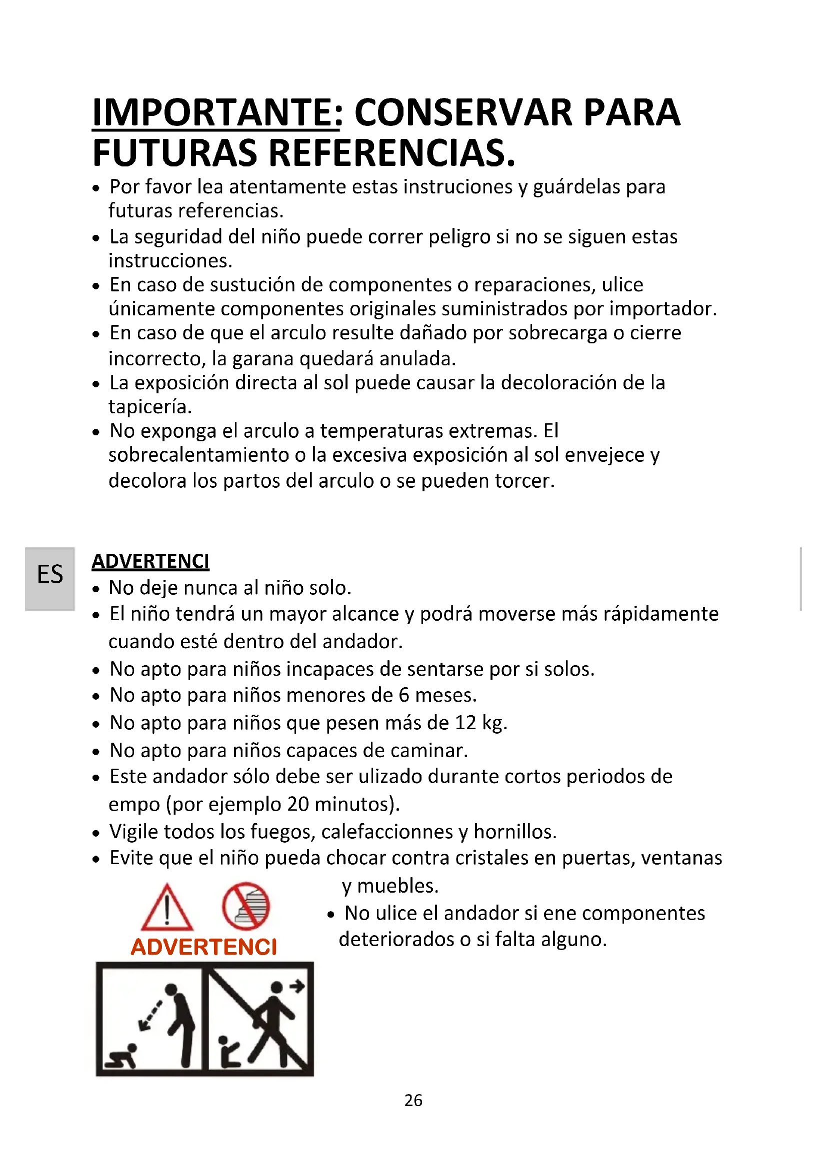 Asegürese de que el andador está totalmente desplegada y que todas las piezasVRTES estén bien ancladas antes de sentar al niño en el andador.