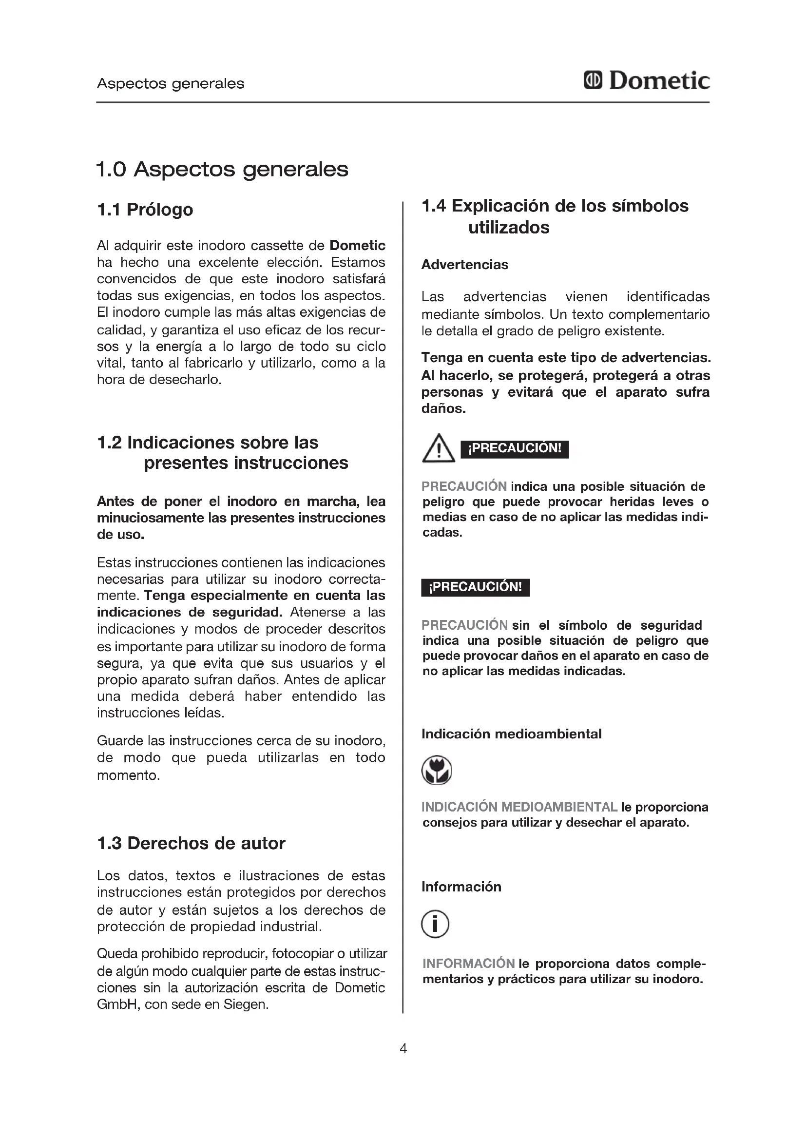 Al adquirir este inodoro cassette de Dometic ha hecho una excelente elección. Estamos convencidos de que este inodoro satisfará todas sus exigencias, en todos los aspectos. El inodoro cumple las más altas exigencias de calidad, y garantiza el uso eficaz de los recur- sos y la energía a lo largo de todo su ciclo vital, tanto al fabricarlo y utilizarlo, como a la hora de desecharlo.