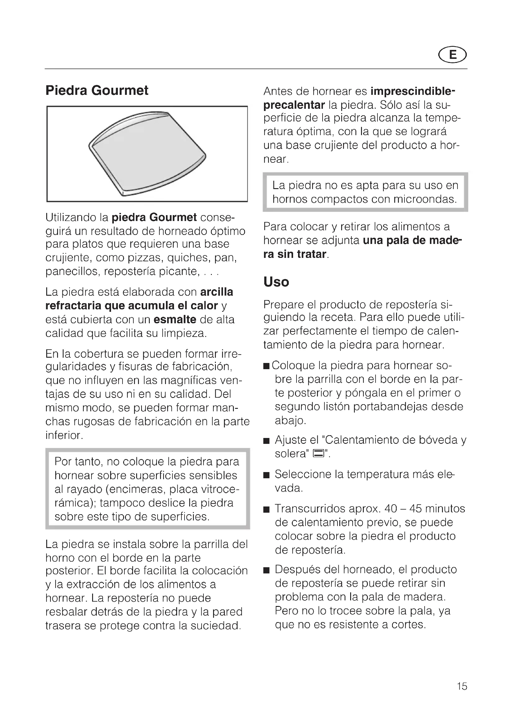 rámica); tampoco deslice la piedra sobre este tipo de superficies. La piedra se instala sobre la parrilla del horno con el borde en la parte posterior. El borde facilita la colocación y la extracción de los alimentos a hornear. La repostería no puede resbalar detrás de la piedra y la pared trasera se protege contra la suciedad. Antes de hornear es imprescindible