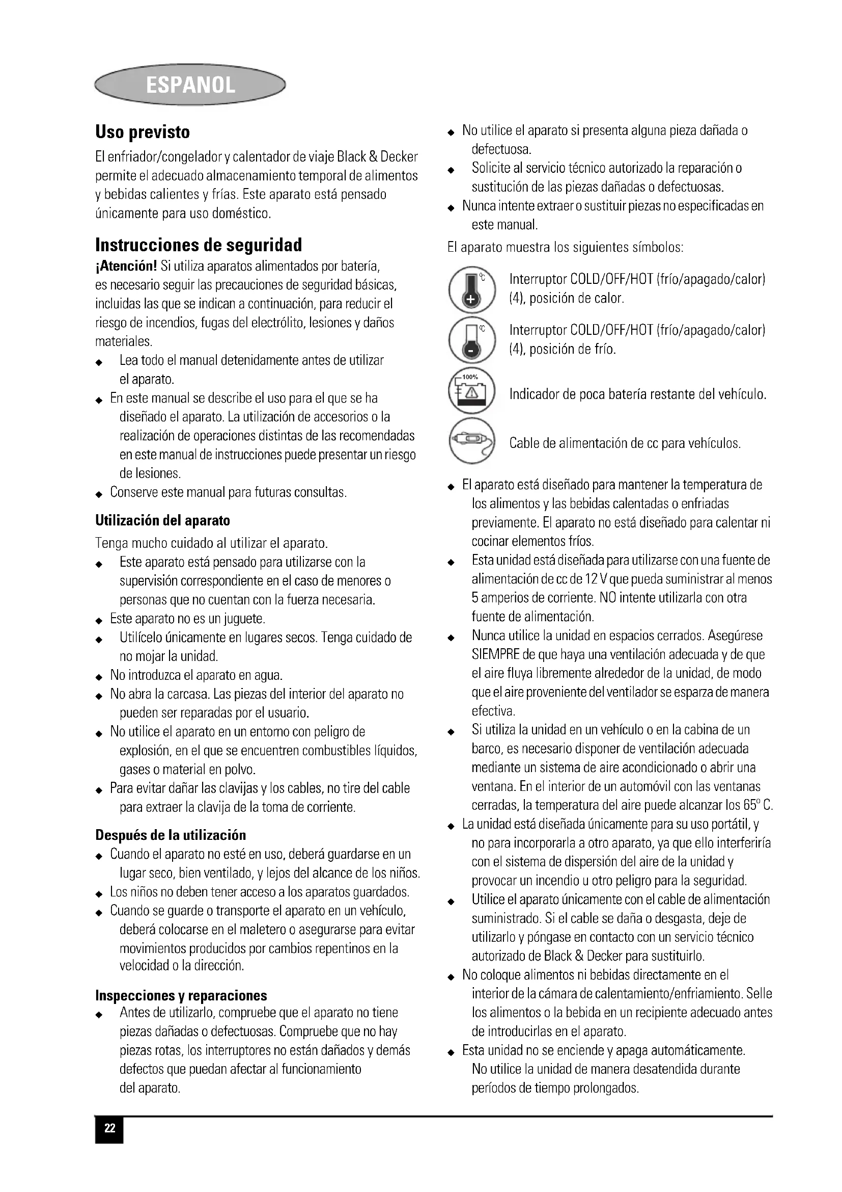 El enfriador/congelador y calentador de viaje Black & Decker permite el adecuado almacenamiento temporal de alimentos y bebidas calientes y frías. Este aparato está pensado únicamente para uso doméstico.