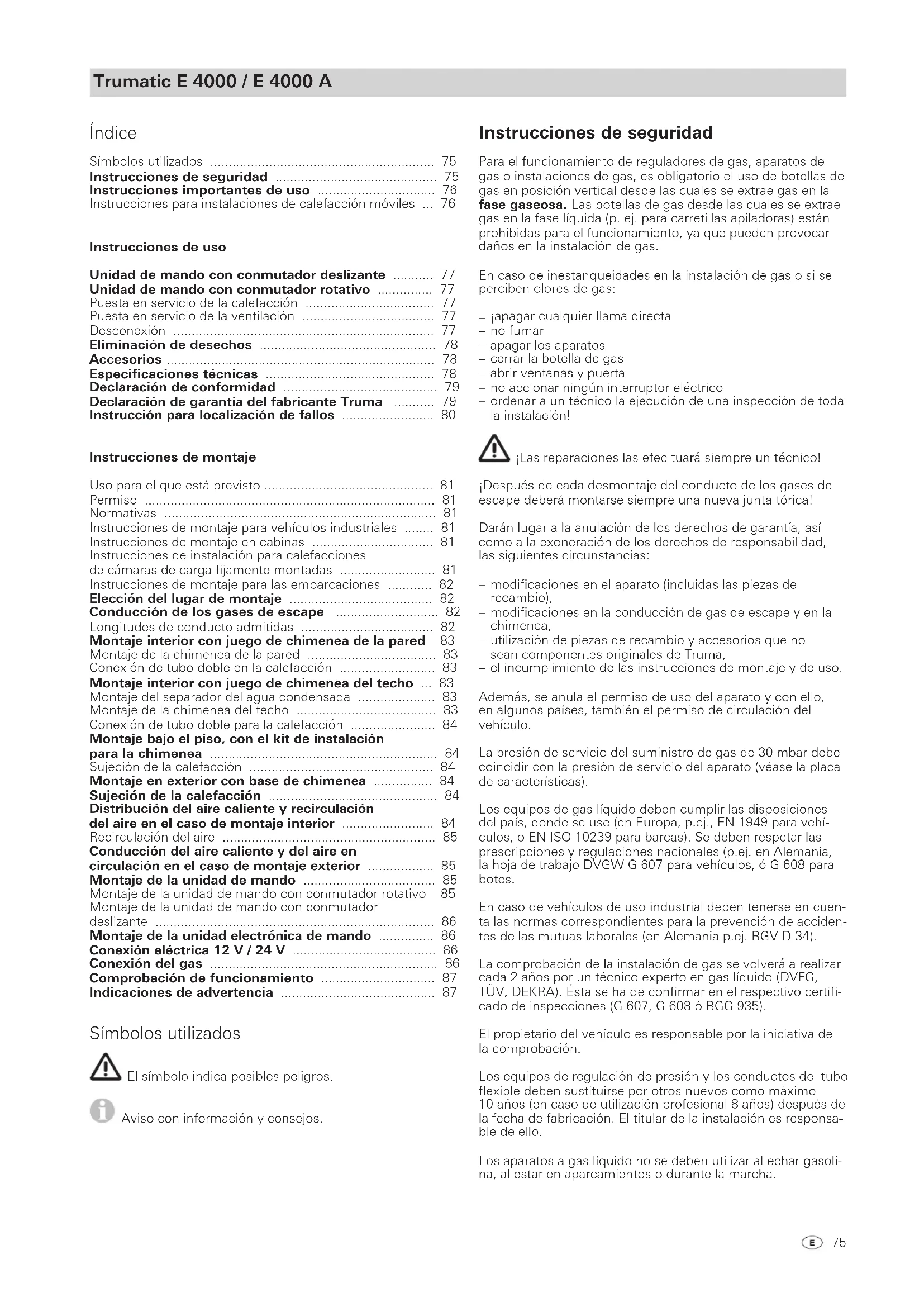 Símbolos utilizados El símbolo indica posibles peligros. Aviso con información y consejos.76 Al poner por primera vez en funcionamiento un aparato nuevo (o tras largos periodos de desuso) puede darse brevemente una ligera formación de humo y olores. Cuando esto ocurra, se aconseja poner el aparato al máximo y ventilar bien la estancia. Un ruido del quemador desacostumbrado o, la elevación de la llama hace presuponer un defecto del regulador y hace nece- saria la verificación del regulador. Los objetos sensibles al calor (p.ej. botes de spray) no deben depositarse en el espacio de montaje de la calefacción, ya que aquí las temperaturas pueden ser elevadas. Para la instalación de gas deben utilizarse únicamente disposi- tivos reguladores de presión según norma EN 12864 (en vehí- culos) o norma EN ISO 10239 (para botes) con una presión de salida fija de 30 mbar. El contingente de circulación del dispo- sitivo regulador de presión debe por lo menos corresponder al consumo máximo de todos los aparatos incorporados por el fabricante de la instalación. Para vehículos, recomendamos los sistemas reguladores de presión de gas Truma SecuMotion / MonoControl CS, y para el equipo de dos bombonas, los reguladores de presión de gas Truma DuoComfort / DuoControl CS. Con temperaturas entorno a los 0 °C e inferiores, el regulador de presión de gas o la válvula de inversión deben funcionar con la calefacción del regulador EisEx. Se deben utilizar únicamente tubos de empalme de regulador adecuados al país de destino, que satisfacen los requisitos del país. Estos se han de comprobar con regularidad en cuanto a su fragilidad. Para servicio de invierno se deberán utilizar sola- mente tubos especiales a prueba de heladas. En el caso de que el regulador de presión esté expuesto a las influencias meteorológicas – sobre todo en los camiones – se deberá proteger siempre por medio de la campana protectora Truma (accesorio de serie en el kit para montaje en camión). Instrucciones importantes de uso Si la chimenea se ha colocado en las inmediaciones o direc- tamente debajo de una ventana que se abre, el aparato se tendrá que equipar con un dispositivo de desconexión auto- mática, a fin de evitar la posibilidad de funcionamiento con la ventana abierta. El tubo doble de los gases de escape deberá controlarse regu- larmente, especialmente en viajes largos, para cerciorarse de que no está dañado y está firmemente conectado, asi mis- mo, se verificará la sujeción del calentador de agua y de la chimenea. ¡Después de una deflagración (encendido fallido) deje que el técnico verifique el conducto de los gases de escape! En las calefacciones montadas en el exterior del vehículo se han de comprobar periódicamente las tuberías flexibles de conducción del aire por si estuviesen dañadas. Una tubería en mal estado podría ser la causa de que los gases de escape se introdujeran en el vehículo. La chimenea de evacuación de los gases de escape y de ali- mentación del aire de combustión se ha de mantener siempre libre de suciedad (nieve convertida en barro, hojarasca, etc.). El limitador de temperatura incorporado bloquea la alimenta- ción de gas cuando el aparato está demasiado caliente. Por esta razón, las salidas del aire caliente y la abertura para el retorno del aire de circulación no deben estar cerradas. En caso de avería de la placa de control, envíela bien almoha- dillada para que no sufra daños. Si esto no se tiene en cuenta, se anula cualquier derecho de garantía. ¡Como pieza de re- puesto utilice solamente la placa de control original! Para la calefacción de motocaravanas durante la marcha, la directiva 2004/78/CE prescribe la instalación de un dispositivo de bloqueo de seguridad. Los reguladores de presión de gas Truma SecuMotion / MonoControl CS cumplen este requisito. Si no hay instalado ningún dispositivo de bloqueo de seguridad (p.ej. como en el regulador de presión de gas Truma SecuMotion / MonoControl CS), la bombona de gas de- be estar cerrada durante la marcha y deben colocarse rótulos de aviso dentro del armario de bombonas y cerca de la uni- dad de mando. Para la calefacción en caravanas durante la marcha recomen- damos, por seguridad, instalar también el dispositivo de blo- queo de seguridad. Si los gases de escape se conducen por debajo del piso, el suelo del vehículo deberá ser estanco al paso de los mismos. Además debajo del suelo del vehículo deberán quedar por lo menos tres lados libres para garantizar que los gases de escape podrán salir sin obstáculo alguno (nieve, faldillas guar- dafangos etc.). Instrucciones para instalaciones de calefacción móviles Están autorizadas por las mutualidades profesionales las ca- lefacciones móviles del compartimiento de carga de Truma. Se trata de instalaciones de calefacción completas, las cuales sencillamente podrán levantarse cuando sea necesario con las mercancías del compartimiento de carga. Las calefacciones son absolutamente autónomas y no requieren ningún tipo de conexiones exteriores. La autorización se refiere úni camente a las calefacciones mó- viles para el compartimento de carga originales suministradas por Truma. ¡Las imitaciones que pudieran existir por terceros no tienen ninguna autorización! Truma excluye cualquier ga- rantía de se-guridad y funcionamiento de una calevacción del compartimiento de carga de imitación. No se admite la utilización en vehículos de transporte de mer- cancías peligrosas.77 ¡Antes de poner en funcionamiento observar necesaria- mente las instrucciones de uso e «Instrucciones impor- tantes de uso!» ¡El propietario del vehículo es responsable de que el manejo del aparato pueda ser el correcto! ¡La etiqueta adhesiva amarilla con indicaciones de adverten- cia suministrada con el aparato deberá ser colocada por el montador o por el propietario del vehículo en un lugar bien visible del vehículo (por ejemplo, en la puerta del