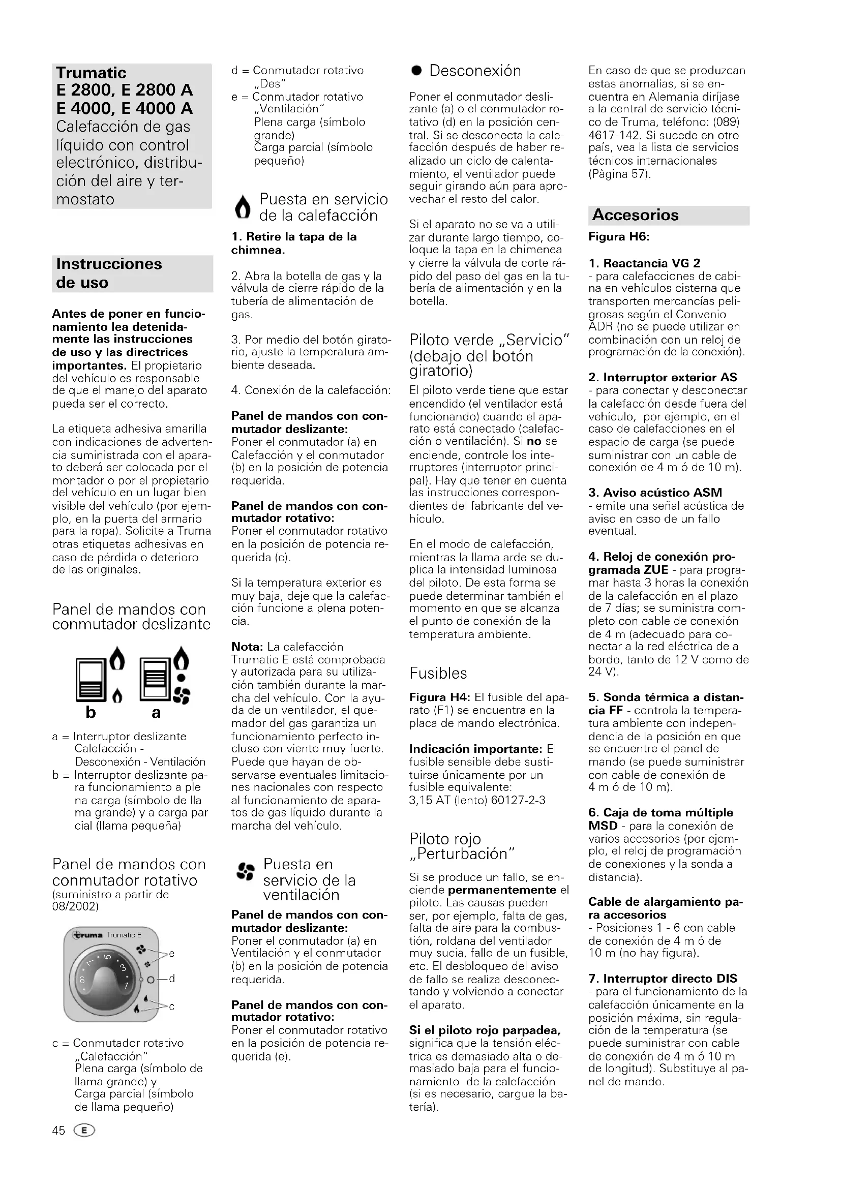 Panel de mandos con con- mutador deslizante: Poner el conmutador (a) en Calefacción y el conmutador (b) en la posición de potencia requerida. Panel de mandos con con- mutador rotativo: Poner el conmutador rotativo en la posición de potencia re- querida (c). Si la temperatura exterior es muy baja, deje que la calefac- ción funcione a plena poten- cia. Nota: La calefacción Trumatic E está comprobada y autorizada para su utiliza- ción también durante la mar- cha del vehículo. Con la ayu- da de un ventilador, el que- mador del gas garantiza un funcionamiento perfecto in- cluso con viento muy fuerte. Puede que hayan de ob- servarse eventuales limitacio- nes nacionales con respecto al funcionamiento de apara- tos de gas líquido durante la marcha del vehículo. Puesta en servicio de la ventilación Panel de mandos con con- mutador deslizante: Poner el conmutador (a) en Ventilación y el conmutador (b) en la posición de potencia requerida. Panel de mandos con con- mutador rotativo: Poner el conmutador rotativo en la posición de potencia re- querida (e). Desconexión Poner el conmutador desli- zante (a) o el conmutador ro- tativo (d) en la posición cen- tral. Si se desconecta la cale- facción después de haber re- alizado un ciclo de calenta- miento, el ventilador puede seguir girando aún para apro- vechar el resto del calor. Si el aparato no se va a utili- zar durante largo tiempo, co- loque la tapa en la chimenea y cierre la válvula de corte rá- pido del paso del gas en la tu- bería de alimentación y en la botella. Piloto verde „Servicio” (debajo del botón giratorio) El piloto verde tiene que estar encendido (el ventilador está funcionando) cuando el apa- rato está conectado (calefac- ción o ventilación). Si no se enciende, controle los inte- rruptores (interruptor princi- pal). Hay que tener en cuenta las instrucciones correspon- dientes del fabricante del ve- hículo. En el modo de calefacción, mientras la llama arde se du- plica la intensidad luminosa del piloto. De esta forma se puede determinar también el momento en que se alcanza el punto de conexión de la temperatura ambiente. Fusibles Figura H4: El fusible del apa- rato (F1) se encuentra en la placa de mando electrónica. Indicación importante: El fusible sensible debe susti- tuirse únicamente por un fusible equivalente: 3,15 AT (lento) 60127-2-3 Piloto rojo „Perturbación” Si se produce un fallo, se en- ciende permanentemente el piloto. Las causas pueden ser, por ejemplo, falta de gas, falta de aire para la combus- tión, roldana del ventilador muy sucia, fallo de un fusible, etc. El desbloqueo del aviso de fallo se realiza desconec- tando y volviendo a conectar el aparato. Si el piloto rojo parpadea, significa que la tensión eléc- trica es demasiado alta o de- masiado baja para el funcio- namiento de la calefacción (si es necesario, cargue la ba- tería). En caso de que se produzcan estas anomalías, si se en- cuentra en Alemania diríjase a la central de servicio técni- co de Truma, teléfono: (089) 4617-142. Si sucede en otro país, vea la lista de servicios técnicos internacionales (Pàgina 57). Accesorios Figura H6: