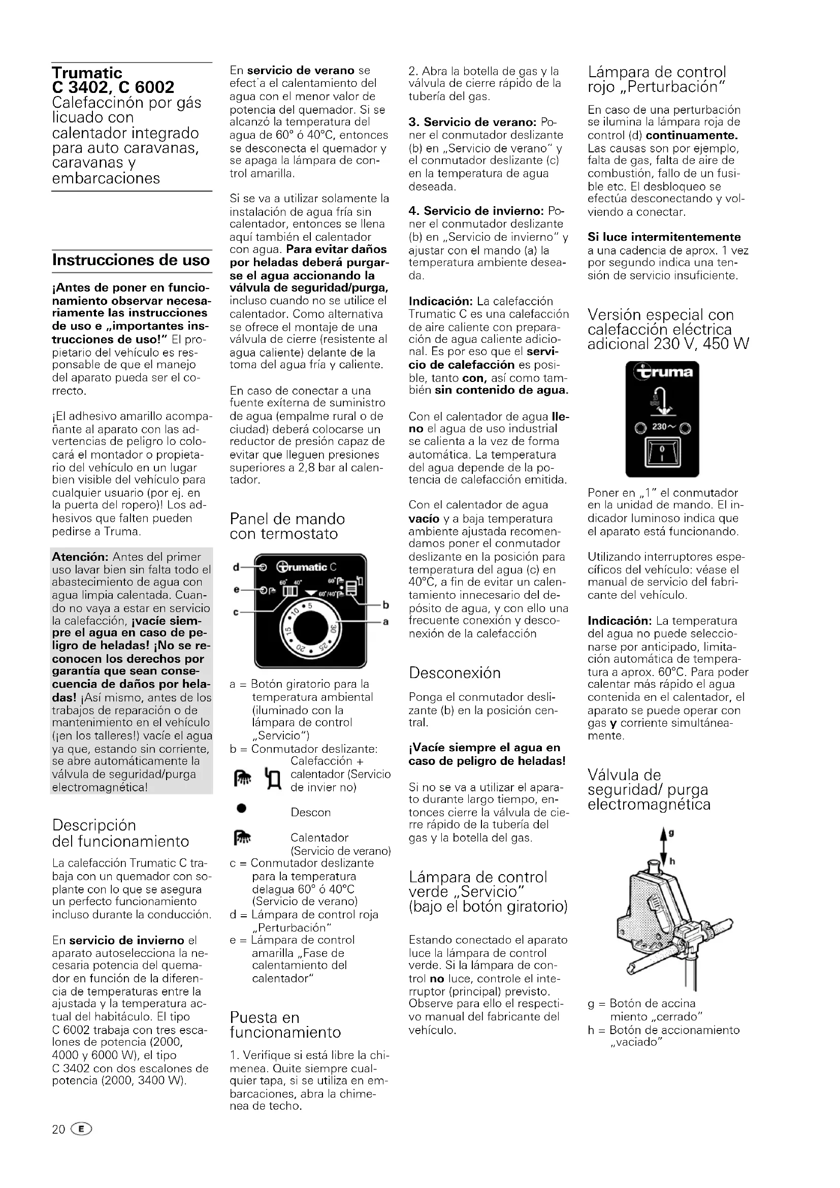 ner el conmutador deslizante (b) en „Servicio de invierno“ y ajustar con el mando (a) la temperatura ambiente desea- da. Indicación: La calefacción Trumatic C es una calefacción de aire caliente con prepara- ción de agua caliente adicio- nal. Es por eso que el servi- cio de calefacción es posi- ble, tanto con, así como tam- bién sin contenido de agua. Con el calentador de agua lle- no el agua de uso industrial se calienta a la vez de forma automática. La temperatura del agua depende de la po- tencia de calefacción emitida. Con el calentador de agua vacío y a baja temperatura ambiente ajustada recomen- damos poner el conmutador deslizante en la posición para temperatura del agua (c) en 40°C, a fin de evitar un calen- tamiento innecesario del de- pósito de agua, y con ello una frecuente conexión y desco- nexión de la calefacción Desconexión Ponga el conmutador desli- zante (b) en la posición cen- tral. ¡Vacíe siempre el agua en caso de peligro de heladas! Si no se va a utilizar el apara- to durante largo tiempo, en- tonces cierre la válvula de cie- rre rápido de la tubería del gas y la botella del gas. Lámpara de control verde „Servicio“ (bajo el botón giratorio) Estando conectado el aparato luce la lámpara de control verde. Si la lámpara de con- trol no luce, controle el inte- rruptor (principal) previsto. Observe para ello el respecti- vo manual del fabricante del vehículo. Lámpara de control rojo „Perturbación“ En caso de una perturbación se ilumina la lámpara roja de control (d) continuamente. Las causas son por ejemplo, falta de gas, falta de aire de combustión, fallo de un fusi- ble etc. El desbloqueo se efectúa desconectando y vol- viendo a conectar. Si luce intermitentemente a una cadencia de aprox. 1 vez por segundo indica una ten- sión de servicio insuficiente. Versión especial con calefacción eléctrica adicional 230 V, 450 W Poner en „1” el conmutador en la unidad de mando. El in- dicador luminoso indica que el aparato está funcionando. Utilizando interruptores espe- cíficos del vehículo: véase el manual de servicio del fabri- cante del vehículo. Indicación: La temperatura del agua no puede seleccio- narse por anticipado, limita- ción automática de tempera- tura a aprox. 60°C. Para poder calentar más rápido el agua contenida en el calentador, el aparato se puede operar con gas y corriente simultánea- mente. Válvula de seguridad/ purga electromagnética g = Botón de accina miento „cerrado” h = Botón de accionamiento „vaciado” Trumatic C 3402, C 6002 Calefaccinón por gás licuado con calentador integrado para auto caravanas, caravanas y embarcaciones 20Indicación importante: La válvula de escape se mantie- ne en estado cerrado por me- dio de una bobina eléctrica. A fin de no cargar innecesaria- mente la batería, se reco- mienda abrir la válvula de es- cape durante tiempos sin uso prolongados. Indicaciones sobre la válvula eléctrica de seguridad/escape Con temperaturas inferiores a 2ºC en la válvula de seguri- dad/ vaciado puede fluir por sí mismo el contenido de agua del calentador cuando el aparato no está en servicio (también en caso de avería). Para evitar la pérdida de agua del aparato, conectar con el conmutador deslizante (b) del panel de mandos (funciona- miento en verano o invierno) y cerrar nuevamente la válvu- la de seguridad/ vaciado des- plazando hacia arriba el bo- tón de accionamiento (posi- ción g). Atención: sin funcionamien- to de calefacción, la válvula de seguridad/vaciado puede cerrarse nuevamente sólo a temperaturas superiores a 8ºC. Llenar el calentador