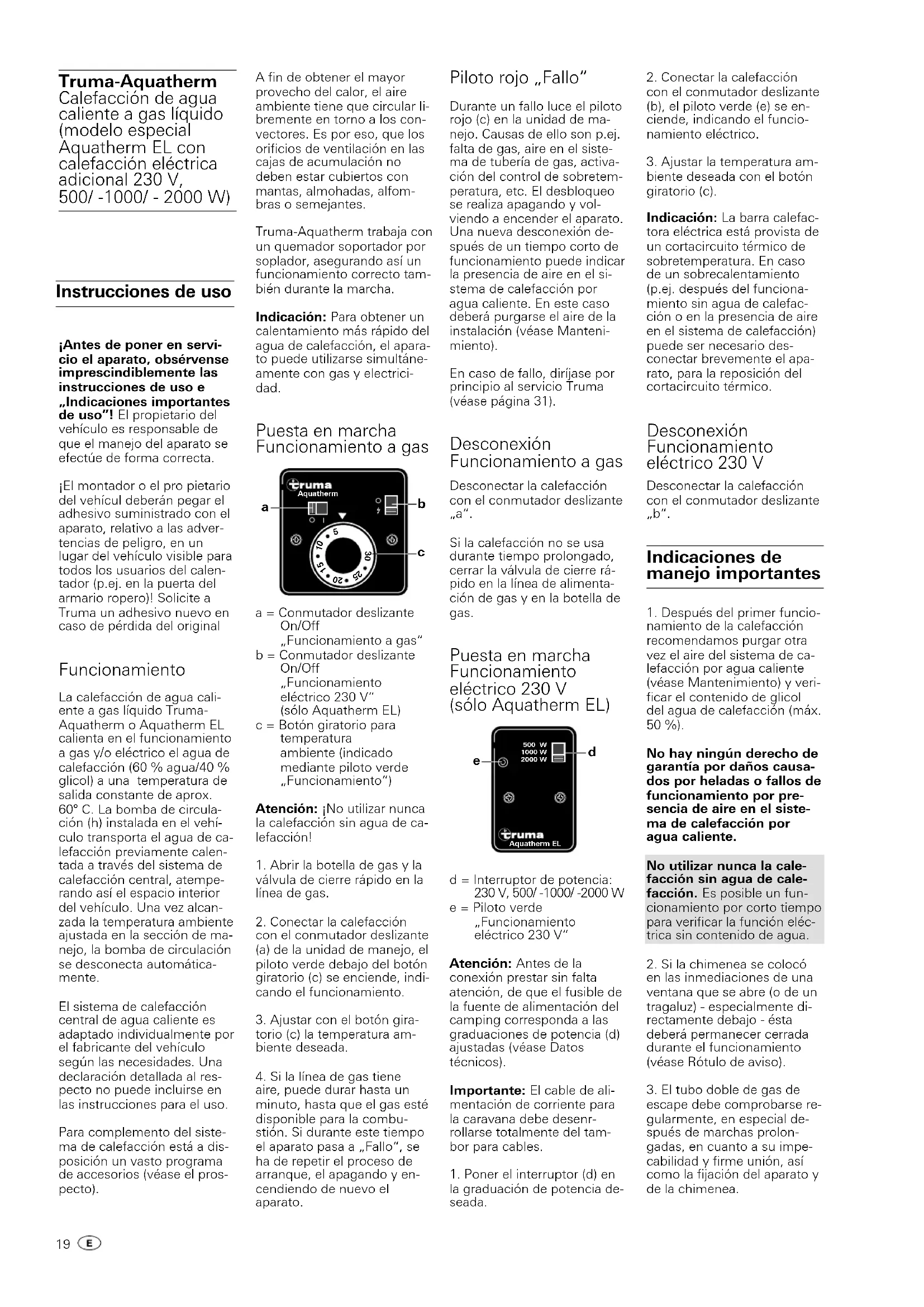 garantiekrav I Tyskland skal man ved fejl kontakte Trumas kundeservi- cecenter i Putzbrunn/ Mün- chen. I udlandet står de respektive servicepartnere (se adresseli- sten) til rådighed. Reklamatio- nen skal beskrives detaljeret. Desuden skal det udfyldte garantibevis forelægges eller apparatets serienummer samt købsdato. Hvis apparatet sendes til fa- brikken, kontrollerer produ- centen, om der er tale om en garantiesag. Ved skade på varmelegemer (varmeveks- lere) skal gastrykregulatoren medsendes. Ved insendelse til fabrikken skal forsendelsen normalt ske som fragtgods. Hvis der er tale om en garantisag påta- ger fabrikken sig om- kostningerne til forsendelsen og returforsendelsen. Hvis der ikke er tale om en garan- tisag, giver producenten bes- ked til kunden om dette og angiver reparationsomkost- ningerne, som ikke dækkes af producenten. I givet fald påh- viler det også kunden at beta- le forsendelsesomkostninger19 ¡Antes de poner en servi- cio el aparato, obsérvense imprescindiblemente las instrucciones de uso e „Indicaciones importantes de uso”! El propietario del vehículo es responsable de que el manejo del aparato se efectúe de forma correcta. ¡El montador o el pro pietario del vehícul deberán pegar el adhesivo suministrado con el aparato, relativo a las adver- tencias de peligro, en un lugar del vehículo visible para todos los usuarios del calen- tador (p.ej. en la puerta del armario ropero)! Solicite a Truma un adhesivo nuevo en caso de pérdida del original Funcionamiento La calefacción de agua cali- ente a gas líquido Truma- Aquatherm o Aquatherm EL calienta en el funcionamiento a gas y/o eléctrico el agua de calefacción (60 % agua/40 % glicol) a una temperatura de salida constante de aprox. 60° C. La bomba de circula- ción (h) instalada en el vehí- culo transporta el agua de ca- lefacción previamente calen- tada a través del sistema de calefacción central, atempe- rando así el espacio interior del vehículo. Una vez alcan- zada la temperatura ambiente ajustada en la sección de ma- nejo, la bomba de circulación se desconecta automática- mente. El sistema de calefacción central de agua caliente es adaptado individualmente por el fabricante del vehículo según las necesidades. Una declaración detallada al res- pecto no puede incluirse en las instrucciones para el uso. Para complemento del siste- ma de calefacción está a dis- posición un vasto programa de accesorios (véase el pros- pecto). A fin de obtener el mayor provecho del calor, el aire ambiente tiene que circular li- bremente en torno a los con- vectores. Es por eso, que los orificios de ventilación en las cajas de acumulación no deben estar cubiertos con mantas, almohadas, alfom- bras o semejantes. Truma-Aquatherm trabaja con un quemador soportador por soplador, asegurando así un funcionamiento correcto tam- bién durante la marcha. Indicación: Para obtener un calentamiento más rápido del agua de calefacción, el apara- to puede utilizarse simultáne- amente con gas y electrici- dad. Puesta en marcha Funcionamiento a gas a = Conmutador deslizante On/Off „Funcionamiento a gas“ b = Conmutador deslizante On/Off „Funcionamiento eléctrico 230 V“ (sólo Aquatherm EL) c = Botón giratorio para temperatura ambiente (indicado mediante piloto verde „Funcionamiento“) Atención: ¡No utilizar nunca la calefacción sin agua de ca- lefacción!
