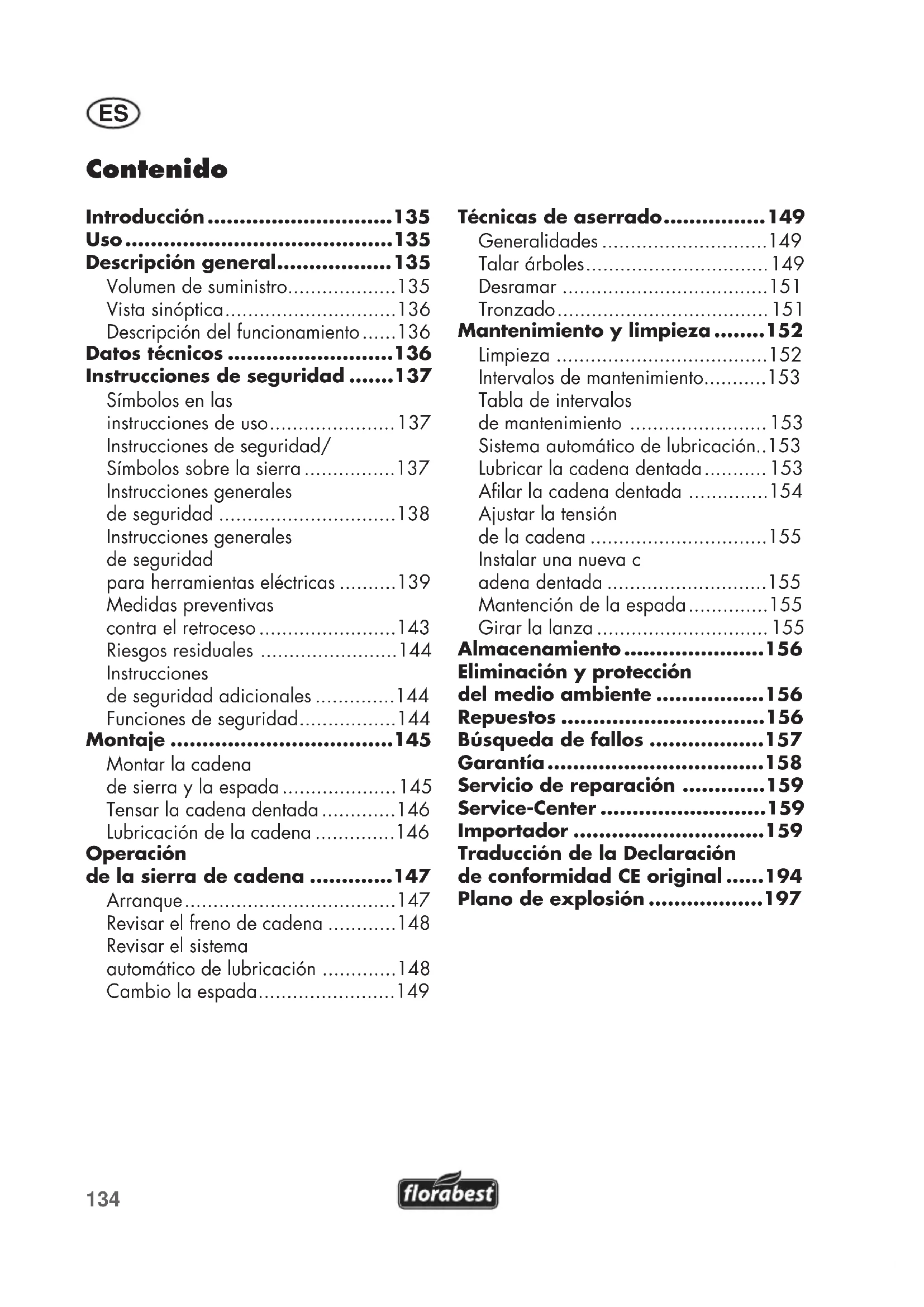 Introducción ¡Felicitaciones por la compra de su nuevo aparato! Con ello se ha decidido por un producto de suprema calidad. Este aparato fue examinado durante la producción con respecto a su calidad y sometido a un control nal. Con ello queda garantizada la capacidad de fun- cionamiento de su aparato. No obstante, no podemos descartar que en algunos casos haya cantidades residuales de agua o lubricantes fuera o dentro del aparato mismo, o bien, en los tubos exibles. Esto no es una deciencia o defecto, ni razón para preocuparse. Las instrucciones de servicio forman parte de este producto. Éstas contie- nen importantes indicaciones para la seguridad, el uso y la eliminación del aparato. Familiarícese con to- das las indicaciones de manejo y seguridad antes de usar el producto. Utilice el producto sólo como se des- cribe y para los campos de aplica- ción indicados. Guarde bien estas instrucciones y entrégueselas al dar este producto a terceros. Uso La sierra eléctrica de cadena fue diseñada sólo para cortar madera. No está prevista para todos los demás nes de uso (p.ej. el corte de albañilería, plástico o alimentos). La sierra de cadena está destinada al área de bricolaje. No fue concebida para el uso profesional permanente. El equipo está destinado para el uso por personal adulto. El uso de la sierra de cadena está permitido sólo bajo vigilancia a adolescentes mayores de 16 años. El fabricante no se responsabi- liza por daños causados por el uso contra- rio al previsto o por operación incorrecta. Dette apparat er ikke egnet til erhvervs- mæssig brug. Ved erhvervsmæssig brug bortfalder garantien. Esta electrosierra de cadena puede ser utilizada sólo por una persona y sólo para cortar madera. La sierra de cadena tiene que ser sostenida con la mano derecha por la empuñadura posterior y con la mano iz- quierda por la empuñadura delantera. An- tes de utilizar la sierra de cadena, el usua- rio tiene que haber leído y entendido todas las indicaciones e instrucciones contenidas en el manual de uso. El usuario tiene que llevar un equipamiento de protección perso- nal (EPP). Con la sierra de cadena sólo se puede cortar madera. ¡No está permitido cortar materiales como p. ej. plástico, pie- dra, metal o madera que contenga cuerpos extraños (p. ej. clavos o tornillos)! Descripción general Encontrará las ilustraciones para la operación y el mantenimiento en las solapas delantera y trasera. Volumen de suministro Desembale el aparato y compruebe que esté completo: - Sierra eléctrica de cadena - Espada (riel guía) (ya montado) - Cadena de sierra (ya montado) - Portador protector de cuchilla - Botella de aceite con 180 ml aceite biol. para cadena - Instrucciones de uso Evacue el material de embalaje de una forma conveniente.136