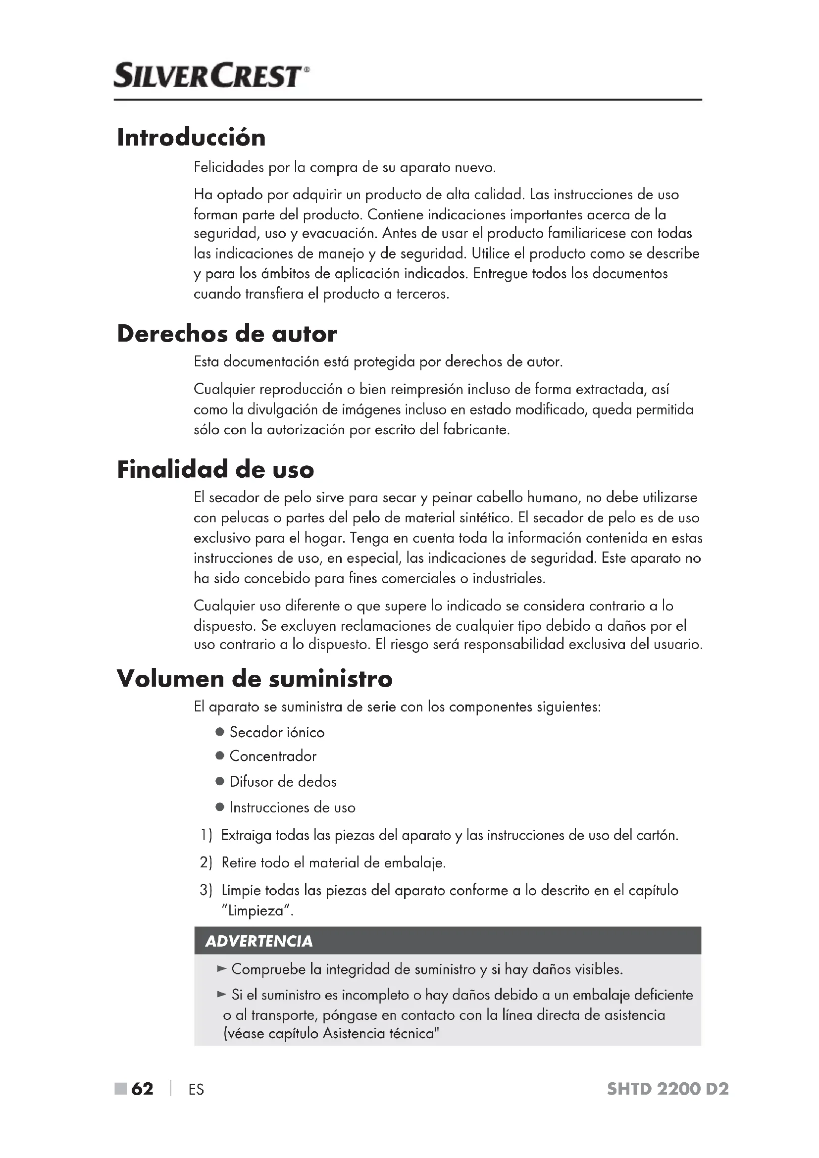 ES SHTD 2200 D2 Introducción Felicidades por la compra de su aparato nuevo. Ha optado por adquirir un producto de alta calidad. Las instrucciones de uso forman parte del producto. Contiene indicaciones importantes acerca de la seguridad, uso y evacuación. Antes de usar el producto familiaricese con todas las indicaciones de manejo y de seguridad. Utilice el producto como se describe y para los ámbitos de aplicación indicados. Entregue todos los documentos cuando transfiera el producto a terceros. Derechos de autor Esta documentación está protegida por derechos de autor. Cualquier reproducción o bien reimpresión incluso de forma extractada, así como la divulgación de imágenes incluso en estado modificado, queda permitida sólo con la autorización por escrito del fabricante. Finalidad de uso El secador de pelo sirve para secar y peinar cabello humano, no debe utilizarse con pelucas o partes del pelo de material sintético. El secador de pelo es de uso exclusivo para el hogar. Tenga en cuenta toda la información contenida en estas instrucciones de uso, en especial, las indicaciones de seguridad. Este aparato no ha sido concebido para fines comerciales o industriales. Cualquier uso diferente o que supere lo indicado se considera contrario a lo dispuesto. Se excluyen reclamaciones de cualquier tipo debido a daños por el uso contrario a lo dispuesto. El riesgo será responsabilidad exclusiva del usuario. Volumen de suministro El aparato se suministra de serie con los componentes siguientes: ▯ Secador iónico ▯ Concentrador ▯ Difusor de dedos ▯ Instrucciones de uso