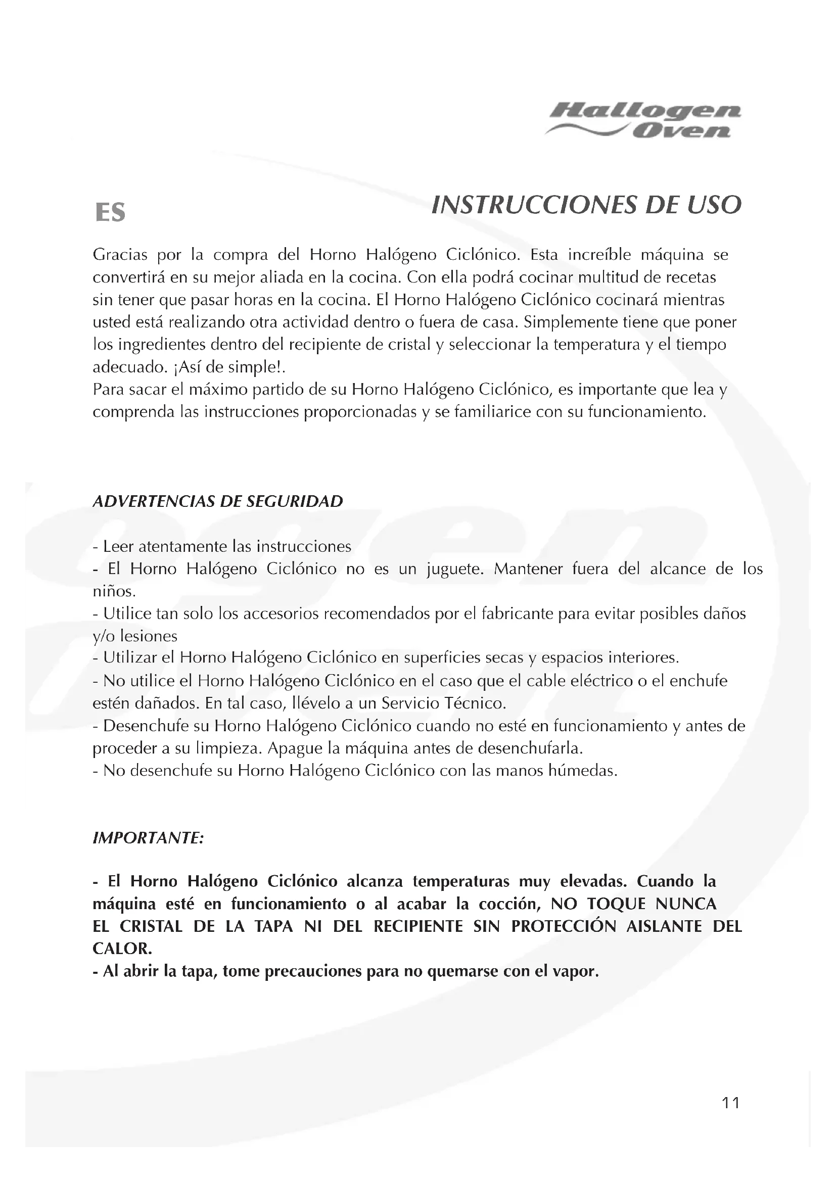 - Leer atentamente las instrucciones - El Horno Halógeno Ciclónico no es un juguete. Mantener fuera del alcance de los niños. - Utilice tan solo los accesorios recomendados por el fabricante para evitar posibles daños y/o lesiones - Utilizar el Horno Halógeno Ciclónico en supercies secas y espacios interiores. - No utilice el Horno Halógeno Ciclónico en el caso que el cable eléctrico o el enchufe estén dañados. En tal caso, llévelo a un Servicio Técnico. - Desenchufe su Horno Halógeno Ciclónico cuando no esté en funcionamiento y antes de proceder a su limpieza. Apague la máquina antes de desenchufarla. - No desenchufe su Horno Halógeno Ciclónico con las manos húmedas. IMPORTANTE: - El Horno Halógeno Ciclónico alcanza temperaturas muy elevadas. Cuando la máquina esté en funcionamiento o al acabar la cocción, NO TOQUE NUNCA EL CRISTAL DE LA TAPA NI DEL RECIPIENTE SIN PROTECCIÓN AISLANTE DEL CALOR. - Al abrir la tapa, tome precauciones para no quemarse con el vapor. ES12 El Horno Halógeno Ciclónico es una verdadera revolución en el campo de la cocción: podrá asar, cocer, dorar, calentar, descongelar, etc. en un tiempo récord todos sus alimentos, ya sea carne, pescado, verdura, etc. Ampliamente utilizado en el mundo profesional, el Horno Halógeno Ciclónico se caracteriza, entre otras cosas, por su sistema de calor giratorio que permite una cocción homogénea y rápida, además de importantes ahorros de energía. - Antes de usar por primera vez su Horno Ciclónico, hágalo funcionar vacío durante unos minutos: 10 minutos a 200 °C. - Es posible que despida olor a quemado, pero no se preocupe, es totalmente normal. - Limpie el interior del recipiente de cristal con una esponja o un trapo húmedo, para que la supercie quede limpia . - Coloque la bandeja de acero debajo del recipiente de cristal y meta dentro los alimentos. - Coloque la tapa en el recipiente de cristal y asegúrese de que los extremos encajen bien el uno con el otro. - Enchufe el aparato. - El asa que hay encima de la tapa debe estar completamente plegada para que el aparato funcione: se trata de una medida de seguridad. - Ajuste el temporizador al tiempo de cocción deseado. - Ajuste el termostato a la temperatura deseada. Para saber los tiempos de cocción y las temperaturas adecuadas, puede consultar la tabla siguiente: