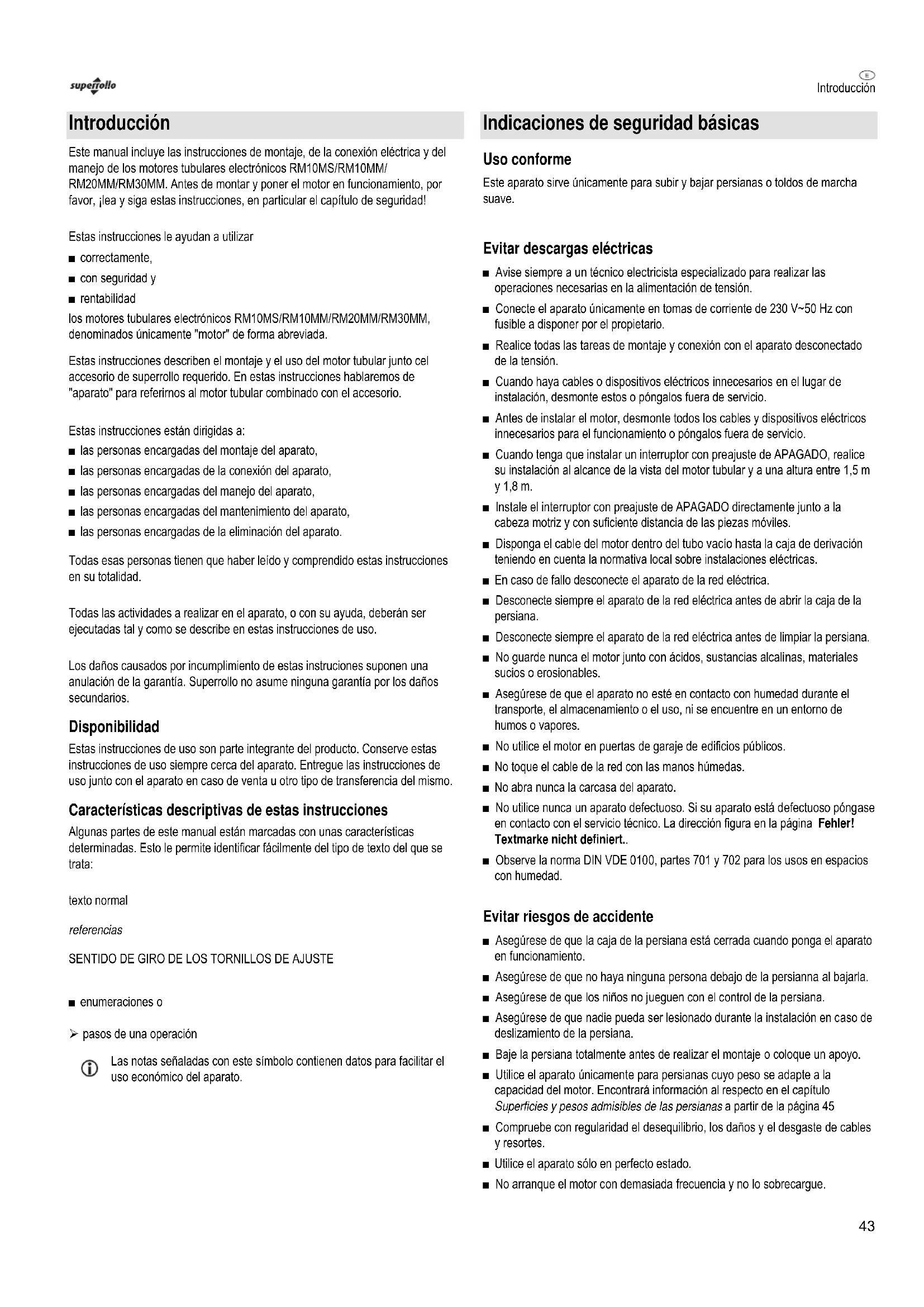 Este manual incluye las instrucciones de montaje, de la conexión electrica y del manejo de los motores tubulares electrónicos RM10MS/RM10MM/ RM20MM/RM30MM. Anteles de montar y poder el motor en funciona bajo, por favor, jlea y siga estas instrucciones, en particular el capitulo de seguridad!