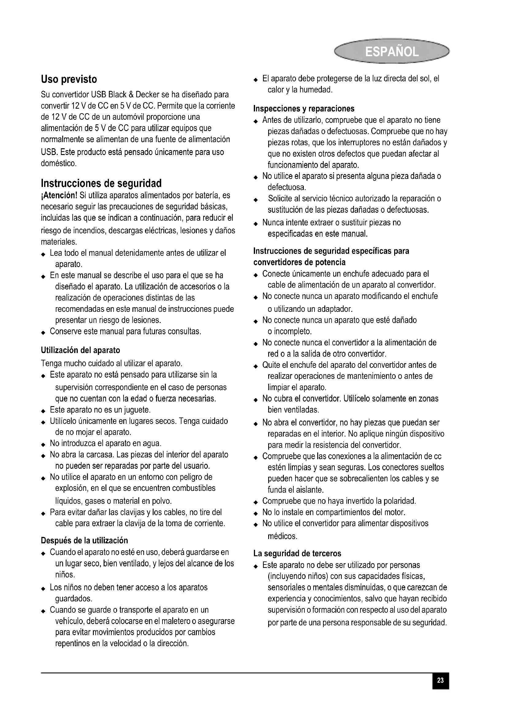 Su convertidor USB Black & Decker se ha disnéado para convertir 12 V de CC en 5 V de CC. Permite que la corriente de 12 V de CC de un automóvil proportionsa una alimentación de 5 V de CC para usar equipos que normalmente se alimentan de una fuente de alimentación USB. Este producto está pensado únicamente para uso dométrico.