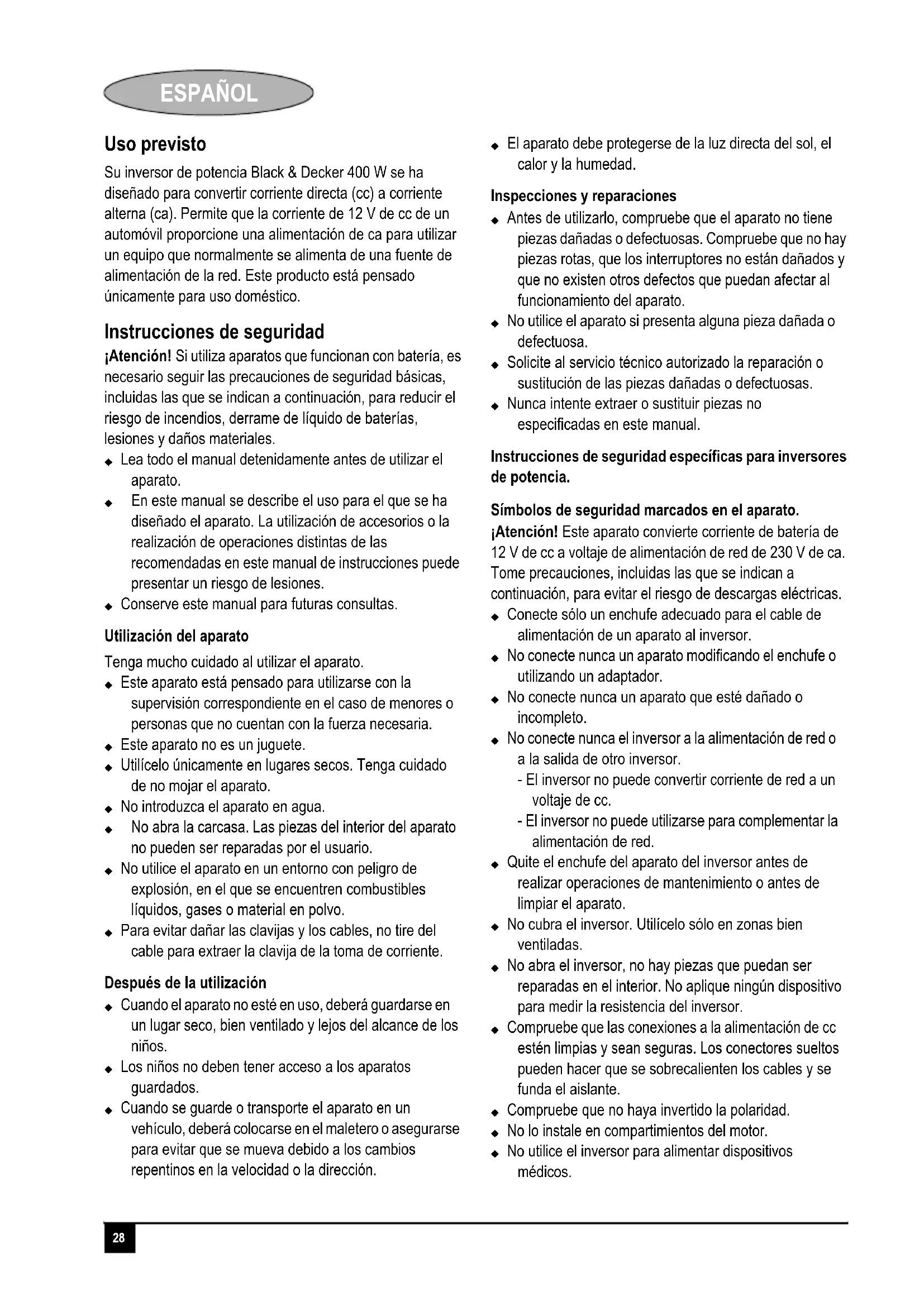 Su invorsor de potencia Black & Decker 400 W se ha disnéado para convertir corriente directa (cc) a corriente alterna (ca). Permitte que la corriente de 12V de cc de un automóvil proportión una alimentación de ca para utiliser un equipo que normalmente se alimenta de una fuente de alimentación de la red. Este producto está pensado únicamente para uso dométrico.