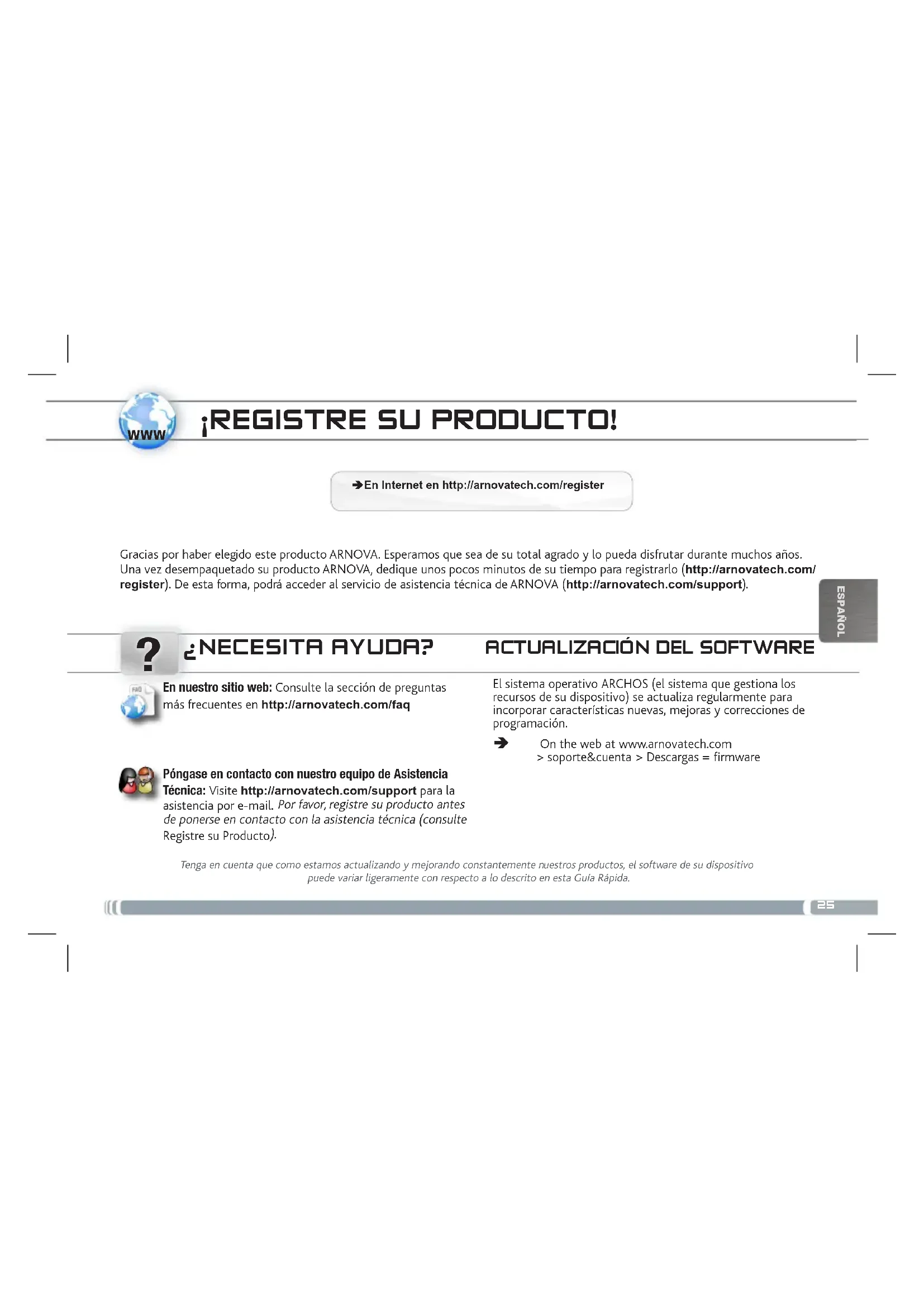 ¡REGISTRE SU PRODUCTO! Gracias por haber elegido este producto ARNOVA. Esperamos que sea de su total agrado y lo pueda disfrutar durante muchos años. Una vez desempaquetado su producto ARNOVA, dedique unos pocos minutos de su tiempo para registrarlo (http://arnovatech.com/ register). De esta forma, podrá acceder al servicio de asistencia técnica de ARNOVA (http://arnovatech.com/support). ÄEn Internet en http://arnovatech.com/register ¿NECESITA AYUDA? Tenga en cuenta que como estamos actualizando y mejorando constantemente nuestros productos, el software de su dispositivo puede variar ligeramente con respecto a lo descrito en esta Guía Rápida.En nuestro sitio web: Consulte la sección de preguntas más frecuentes en http://arnovatech.com/faq