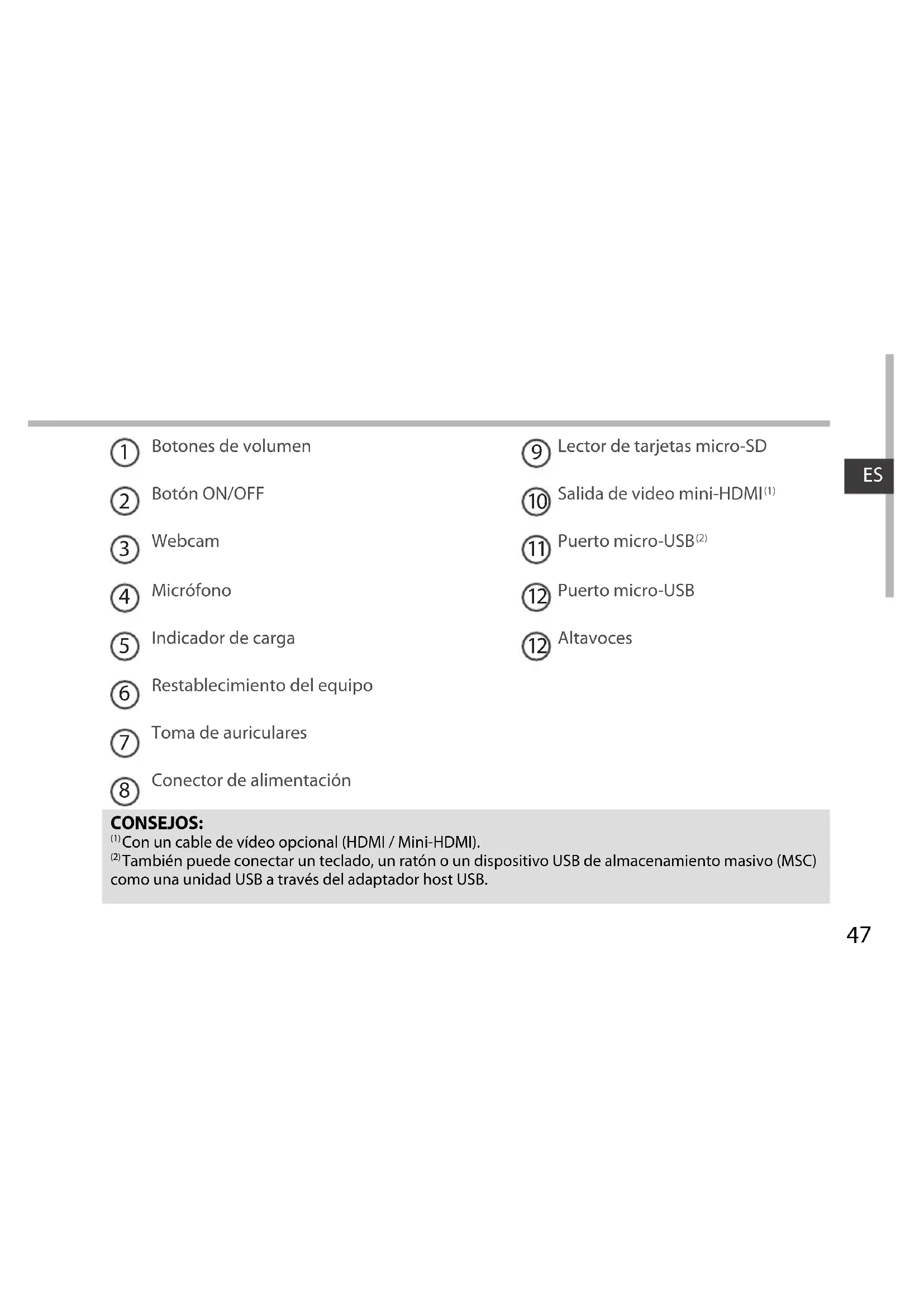 Botones de volumen Botón ON/OFF Webcam Micrófono Indicador de carga Restablecimiento del equipo Toma de auriculares Conector de alimentación Lector de tarjetas micro-SD Salida de video mini-HDMI (1) Puerto micro-USB (2) Puerto micro-USB Altavoces
